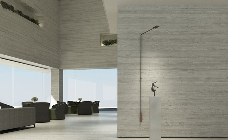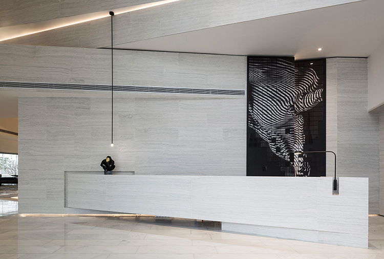 將富有建筑感的體塊元素植入空間中,是ENJOY DESIGN一貫的設(shè)計語言。設(shè)計將沿海的巖石層加以線性的提煉、分解并重組,用水泥石材質(zhì)的體塊以錯位交叉、層疊組合的形態(tài),在空間中演繹著歲月風(fēng)化的痕跡,呈現(xiàn)純粹而有震撼力的觀感。