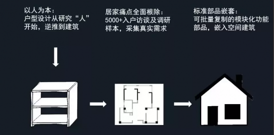 USIZE(優(yōu)舍住宅產(chǎn)業(yè)科技)基于精裝院的逆推式邏輯,即部品——室內(nèi)——建筑,以消費(fèi)者居家需求為設(shè)計(jì)原點(diǎn),按工業(yè)模數(shù)換算出標(biāo)準(zhǔn)功能模塊,確定收納部品尺寸,組合成標(biāo)準(zhǔn)功能空間,根據(jù)動(dòng)線最優(yōu)原理連接空間成戶型,推導(dǎo)出建筑圖紙,并最終落地實(shí)施。