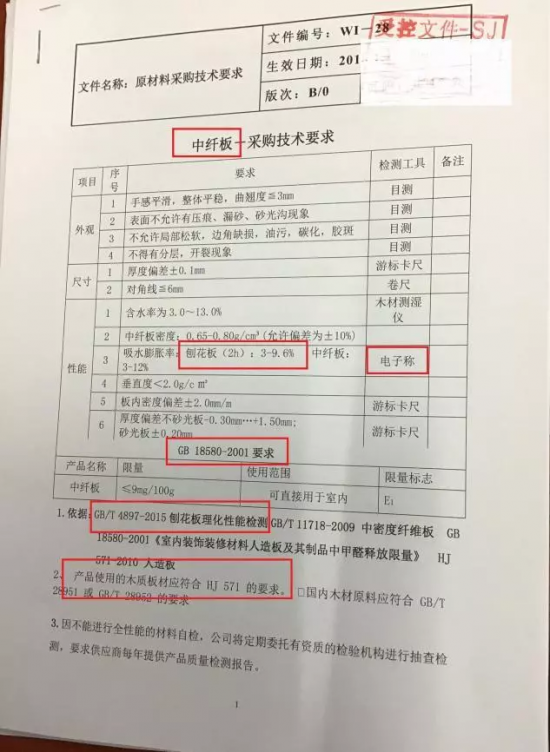 2. 采購技術(shù)要求未及時做更新。主要體現(xiàn)在執(zhí)行的相關(guān)標(biāo)準(zhǔn)早已過期,但是企業(yè)仍按舊標(biāo)準(zhǔn)要求在執(zhí)行采購。比如,人造板甲醛釋放量的國家強制性標(biāo)準(zhǔn)GB 18580已經(jīng)更新至2017版,并且標(biāo)準(zhǔn)內(nèi)容變更很大,已經(jīng)取消E2級別的要求,如果企業(yè)仍按舊標(biāo)準(zhǔn)要求進行采購,不符合國標(biāo)要求的板材很有可能流入生產(chǎn)過程。