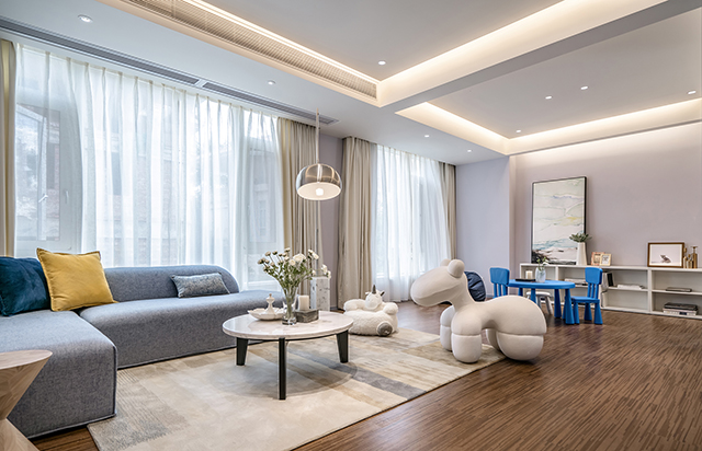 空間擺放著L型同色系沙發(fā)、白色趣味動物座椅、懶人沙發(fā)、柔軟的地毯,滿足一家人的日常休閑需求;而兒童座椅的幾抹海藍色十分出挑,整體搭配在視覺上顯得清爽雅靜。