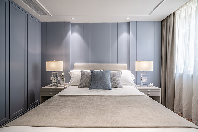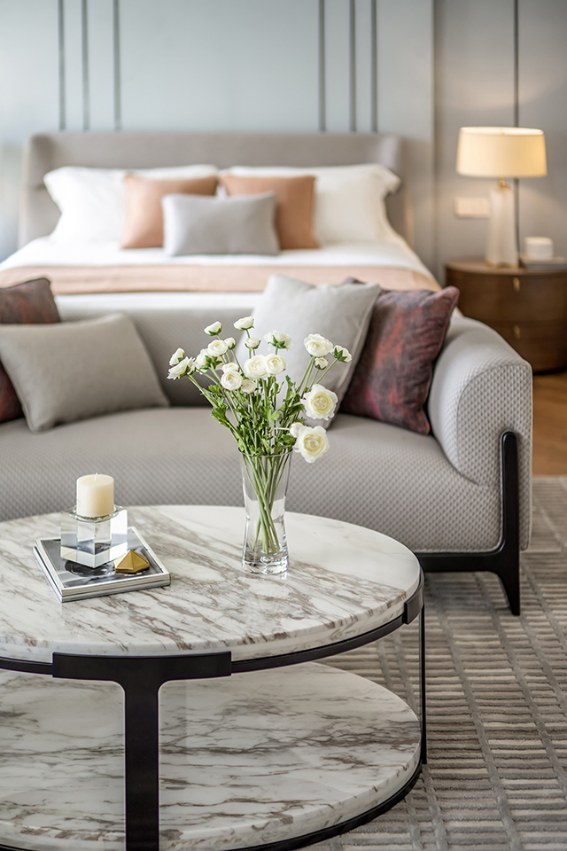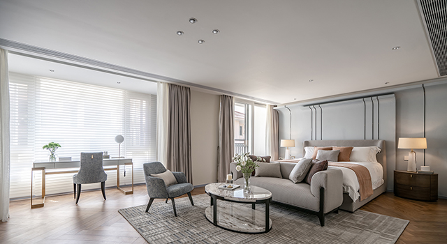 主臥的空間用燕麥色與煙靄色的雅澹作為主調,不同灰度的藍色加以點綴。茶幾、書桌上僅有幾本書與花藝點綴;床品與家具、石材與木質等在品質感上得到了高標準的把控。偌大的衣帽間與衛(wèi)浴室設計,令私享空間更為豐盛。自然的光線透過百葉窗折入室內,形成一層層迷蒙的光暈,時光在這里變得舒緩靜寧。