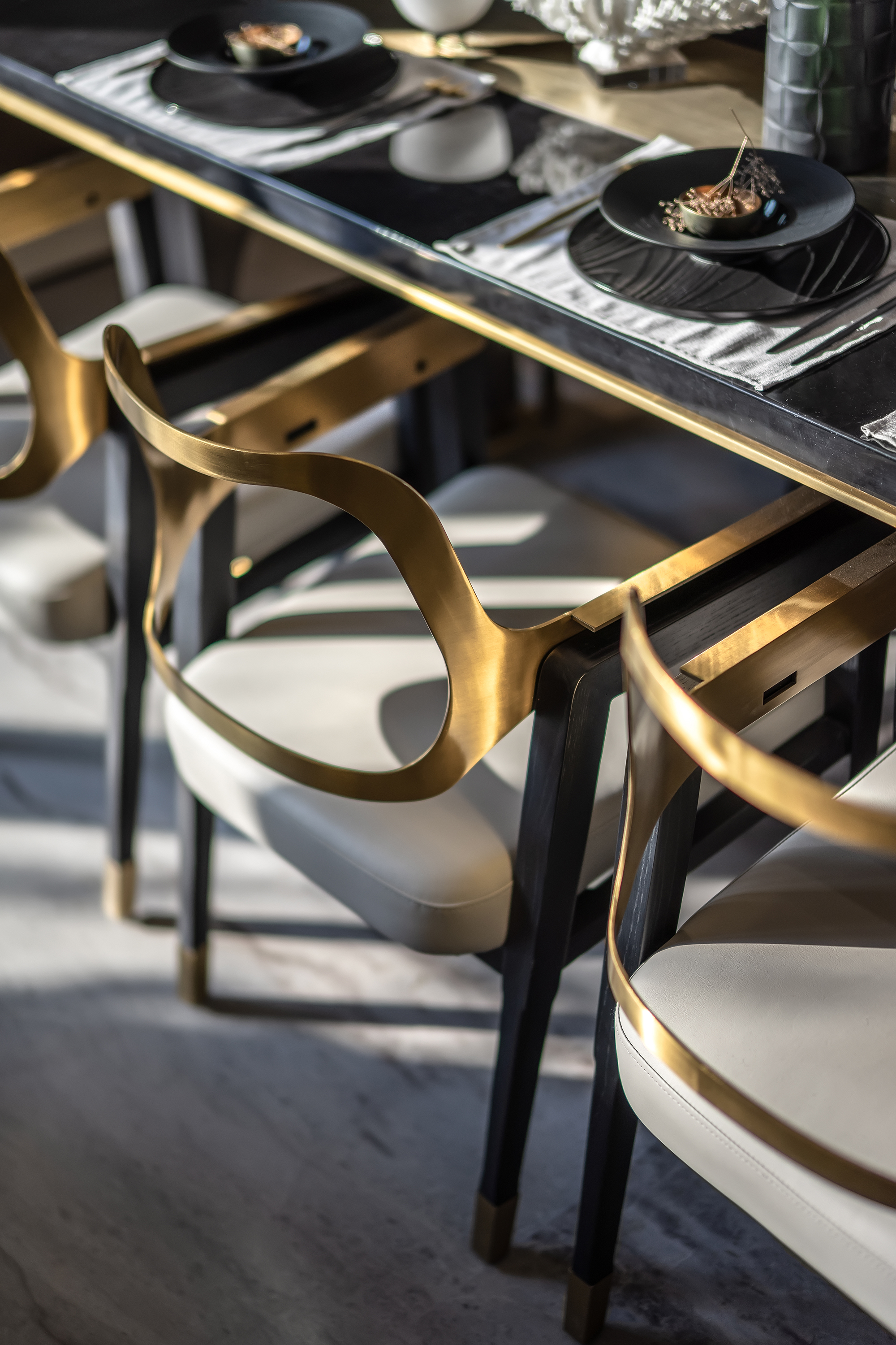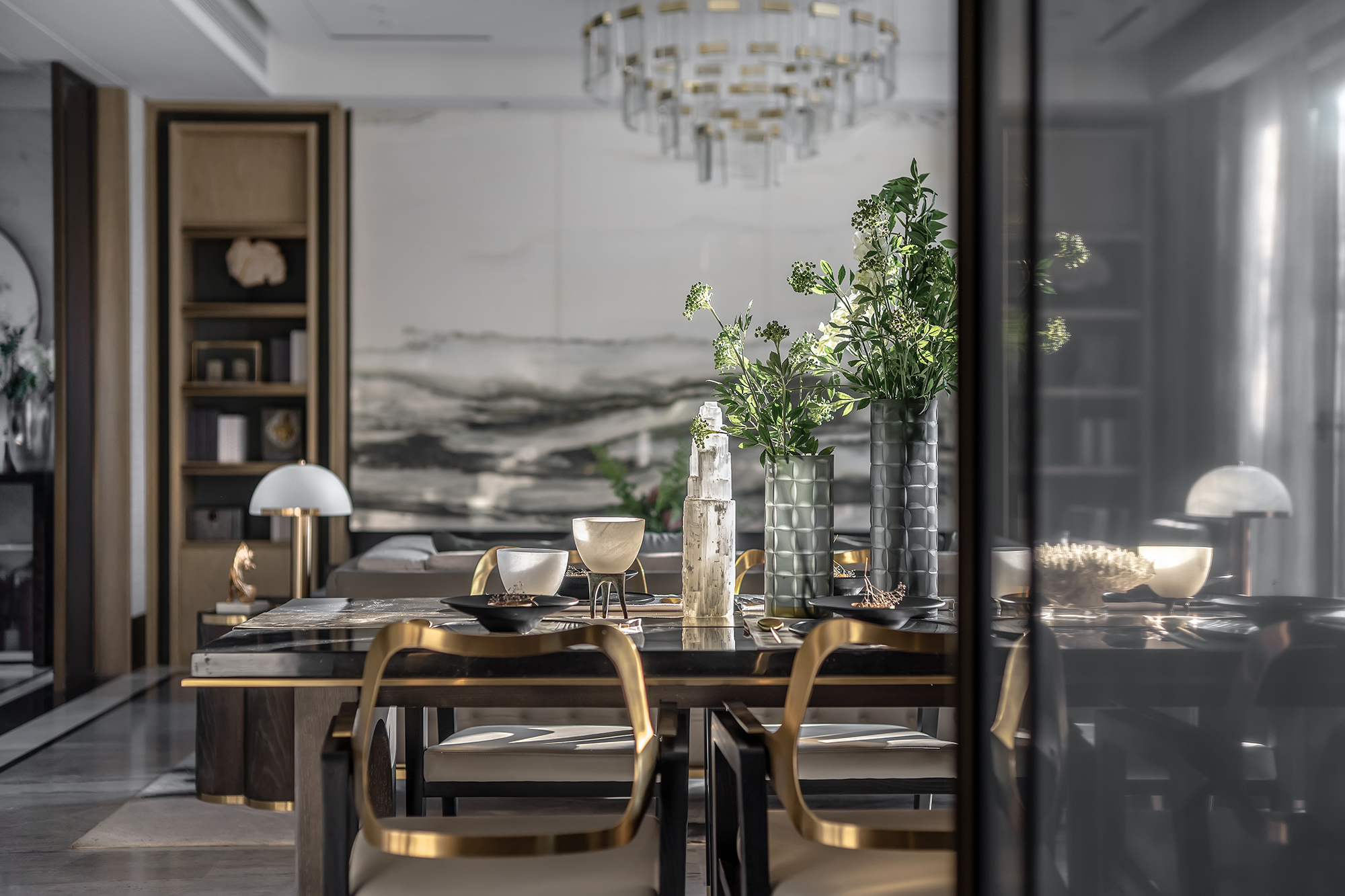 餐廳配合著極簡(jiǎn)的設(shè)計(jì)構(gòu)思, 色彩上以沉穩(wěn)的黑、華麗的金為主色;看似隨意的一把綠葉,如清風(fēng)徐來;雅白如玉的飾品,演繹出東方文化的清雅韻味。