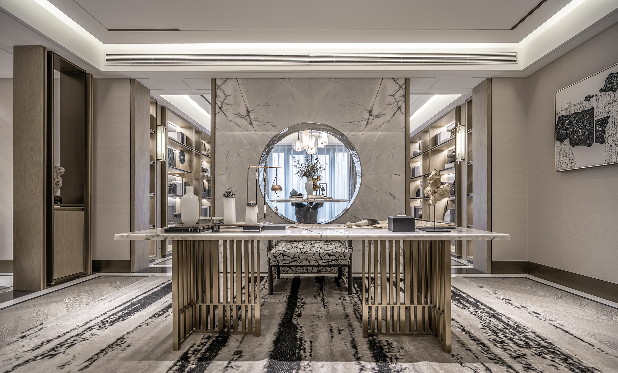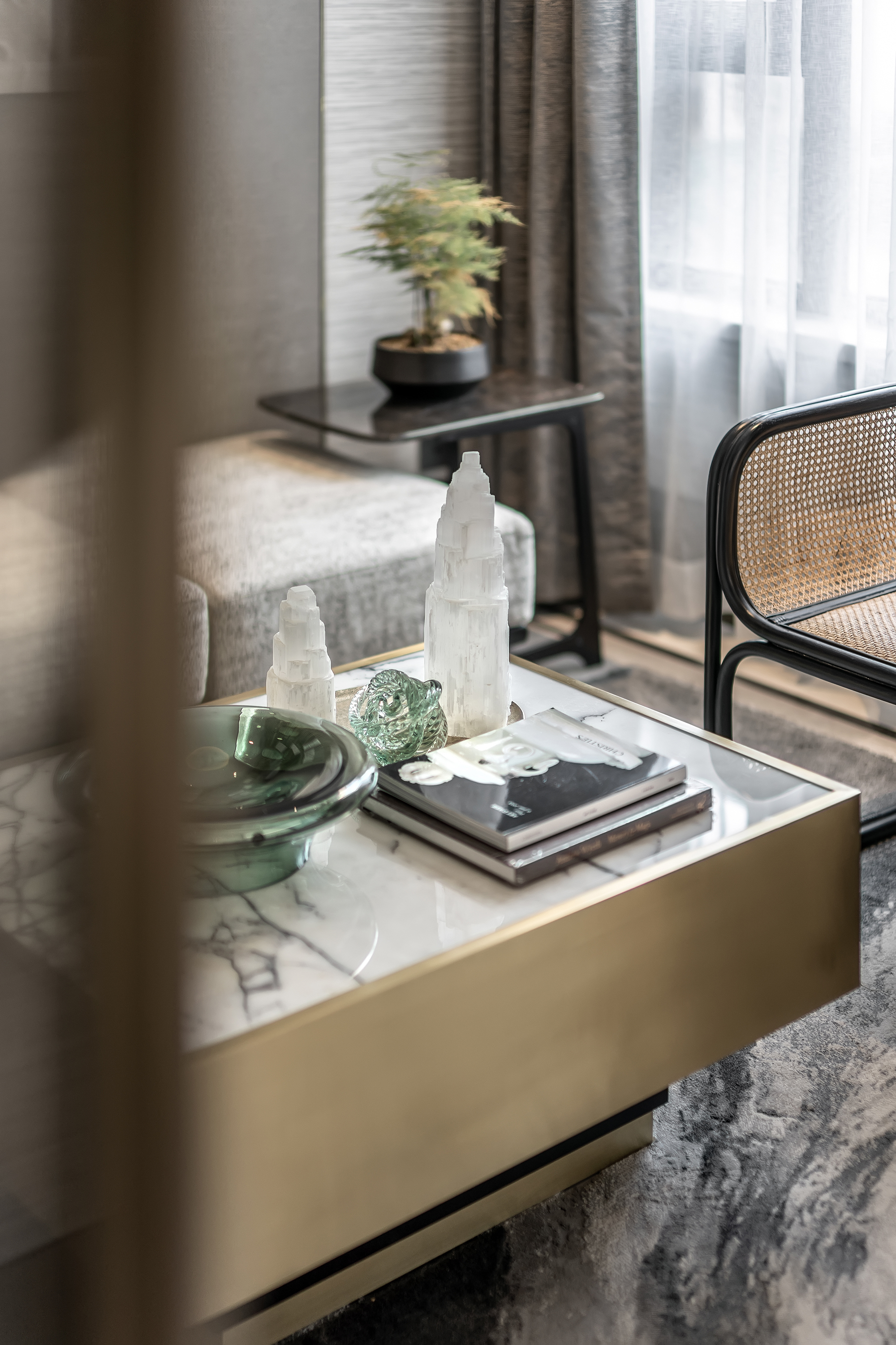 藏書室與書法室相隔的整面墻體以門洞設(shè)計(jì),淡雅設(shè)色、典雅布局、金屬置物架的古銅色,呈現(xiàn)出清亮的質(zhì)感魅力,復(fù)古感的擺設(shè)和現(xiàn)代家具搭配,形構(gòu)出一個(gè)極具格調(diào)的精神寧謐地帶,高級(jí)定制的花藝是空間的妙筆,恰到好處地呈現(xiàn)了一個(gè)現(xiàn)代東方美感世界。