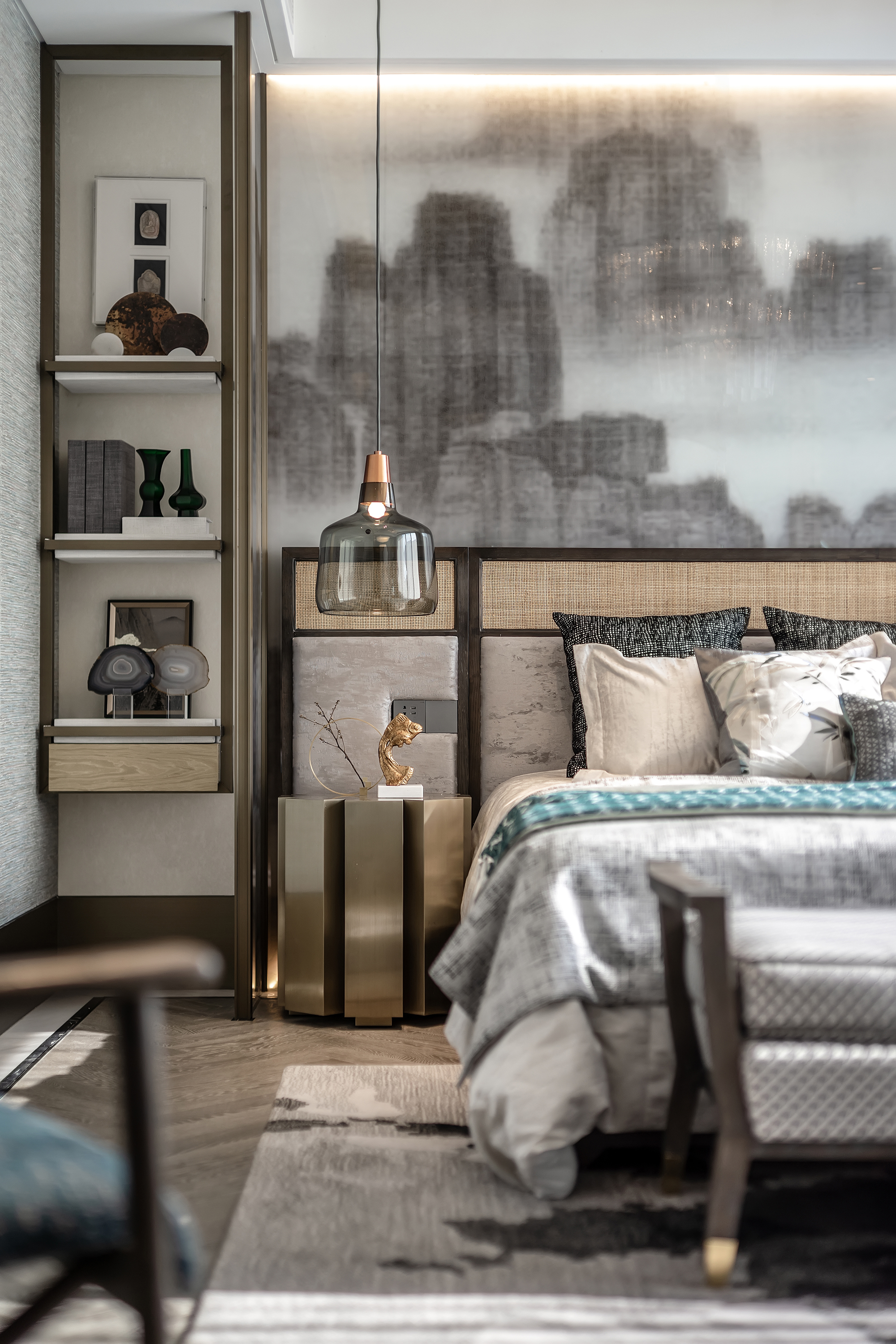 步入主臥,床頭背景墻上,一幅水墨畫營(yíng)造靜中之境,剔除雜瑣碎的裝飾,特殊定制的床頭與邊柜形成呼應(yīng),簡(jiǎn)潔的形式、柔和的線條,清寂的裝飾,不同材質(zhì)與肌理的碰撞,讓人不覺漫游在傳統(tǒng)與現(xiàn)代交織的藝術(shù)世界。