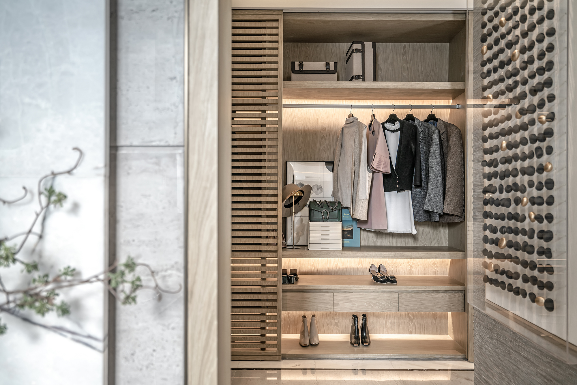 次臥的設(shè)計(jì)中,色彩的運(yùn)用冷靜且克制,沉靜的灰調(diào)和趨近自然的木色是空間的主調(diào)。背景墻上將大理石與木格柵并置,于材質(zhì)的碰撞覓得內(nèi)在的均衡,大理石的紋路自然演繹了一幅自然山水之美,賦予空間綿綿不盡的詩意想象。