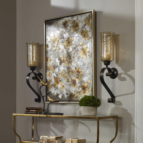 這是一幅以棕褐色為基調(diào),以銀色為光,用仿金箔為主要表現(xiàn)技法的作品,明亮的色調(diào)和富有表現(xiàn)力的筆觸,為空間增添一抹絢麗、愉悅的藝術(shù)色彩。