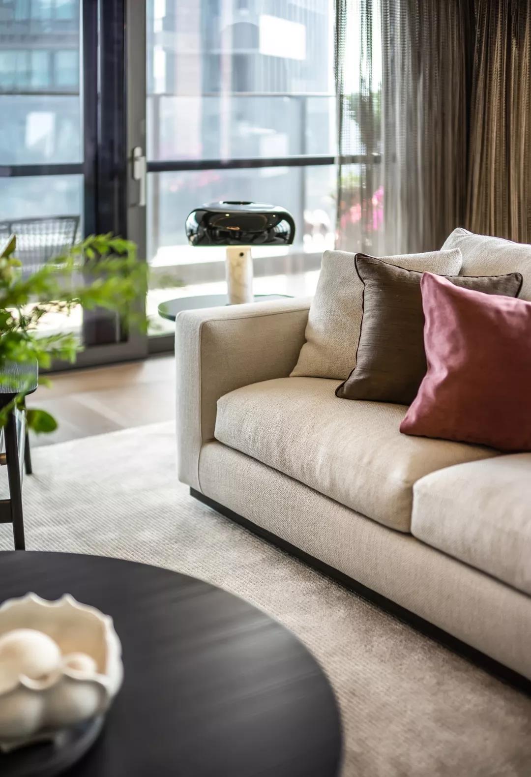 面對(duì)7米寬的客餐廳開間,設(shè)計(jì)師以亞麻與木色這樣低飽和度的色系,打造出簡(jiǎn)雅柔和的空間韻調(diào),為日后的生活場(chǎng)景留足想象與施展的余地。意大利 Minotti 家具品牌沙發(fā)與實(shí)木柜搭配,在柔光下呈現(xiàn)出靜穆的美。裝飾小品不多且簡(jiǎn)凈,幾只茶壇,幾本閑書,嘆茶翻書,便足以架構(gòu)起居住者的生活日常。