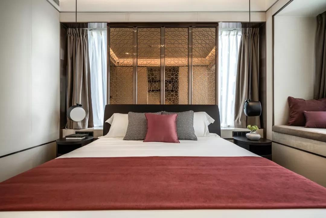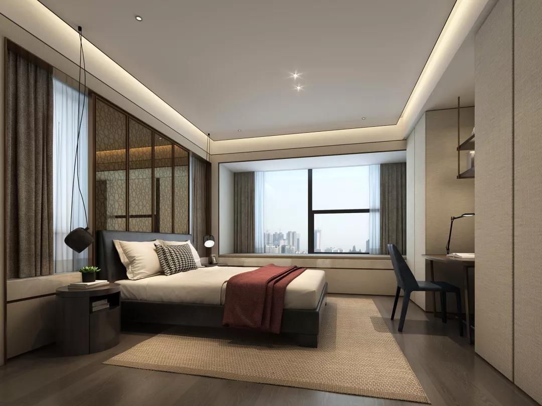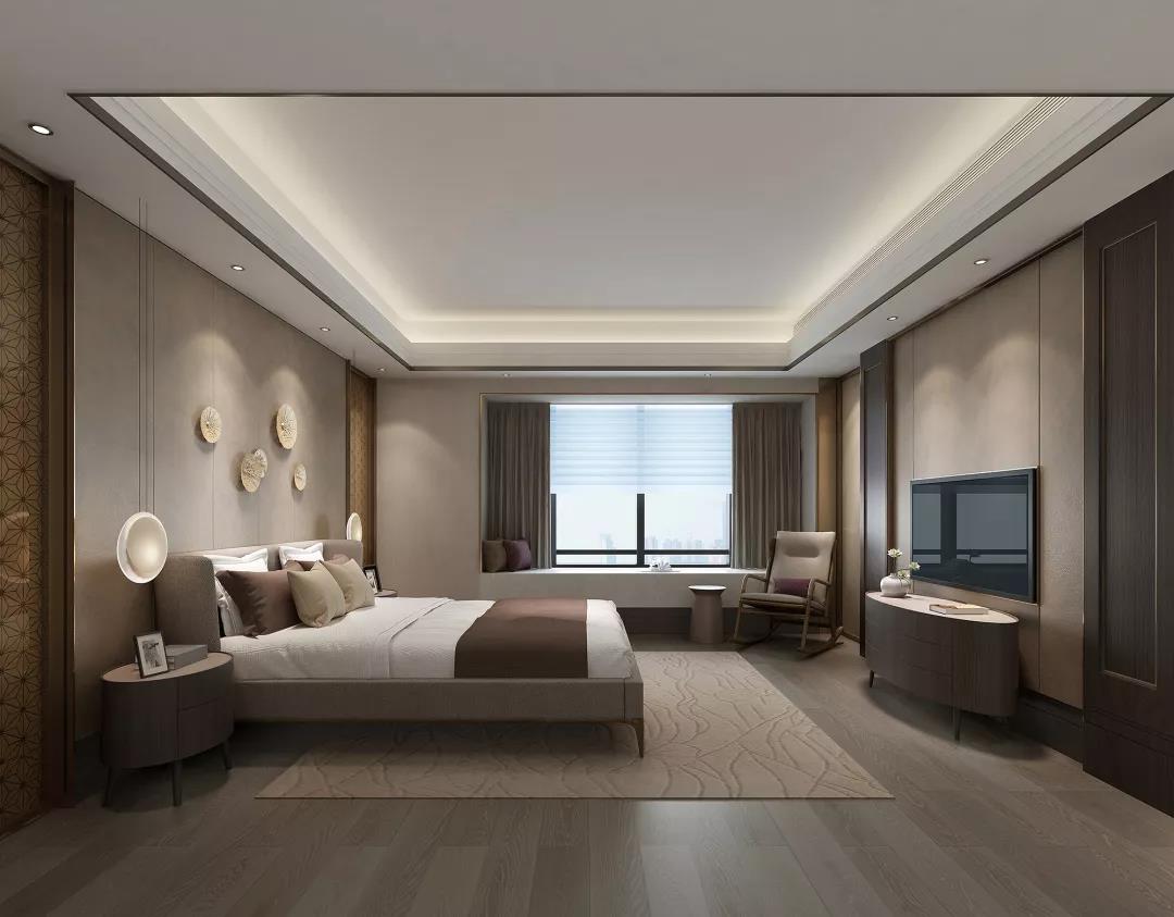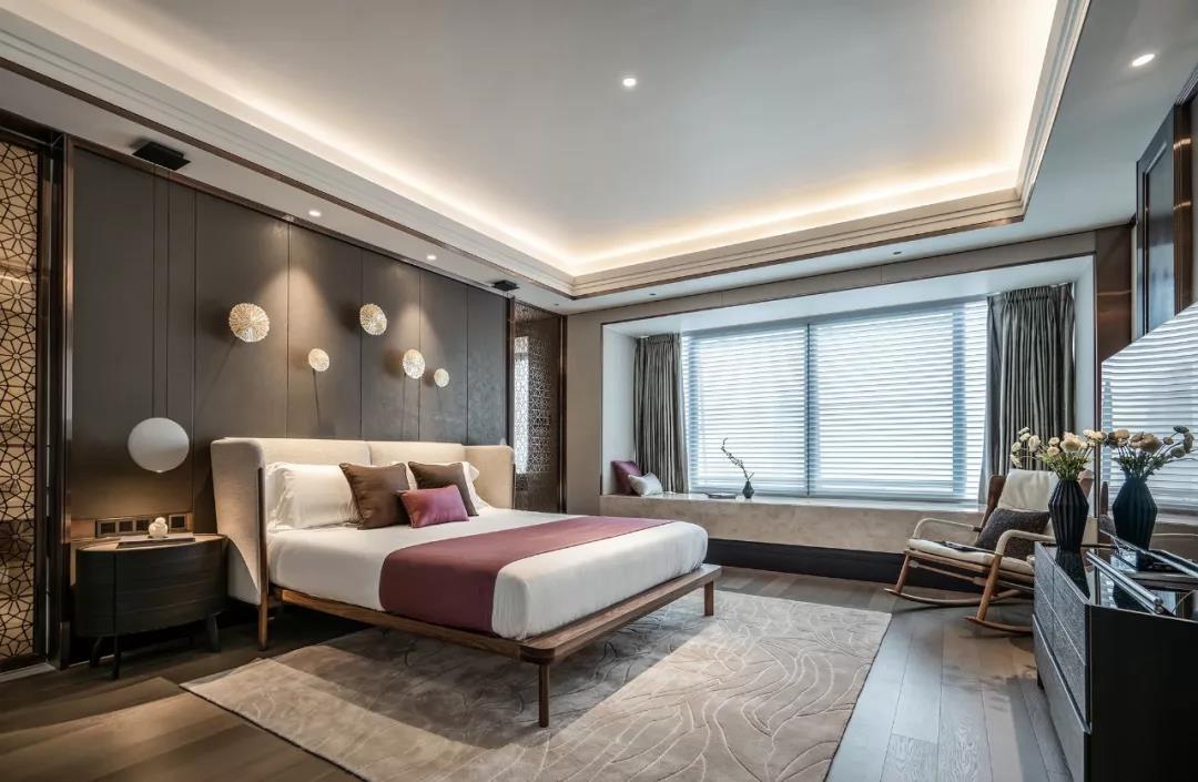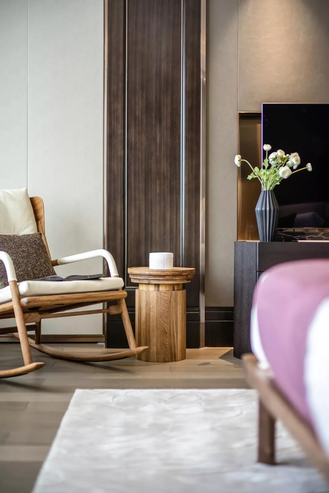主臥無主燈設(shè)計(jì),而是將燈光收納于吊頂內(nèi),使室內(nèi)顯得更為柔和安適。設(shè)計(jì)將真正的尊享藏于每個(gè)細(xì)節(jié),精細(xì)打磨的墻面與木制地板、細(xì)膩柔軟的暖棕色床品,通過材質(zhì)的光感隱透簡(jiǎn)凈高雅的質(zhì)感美學(xué)。