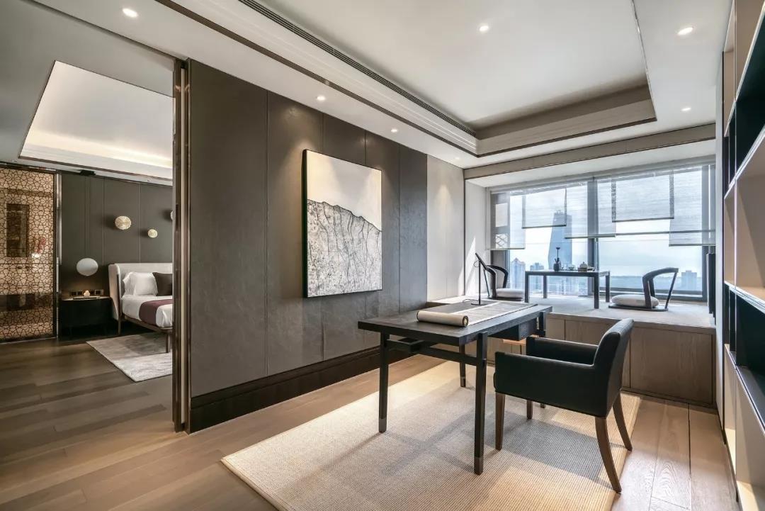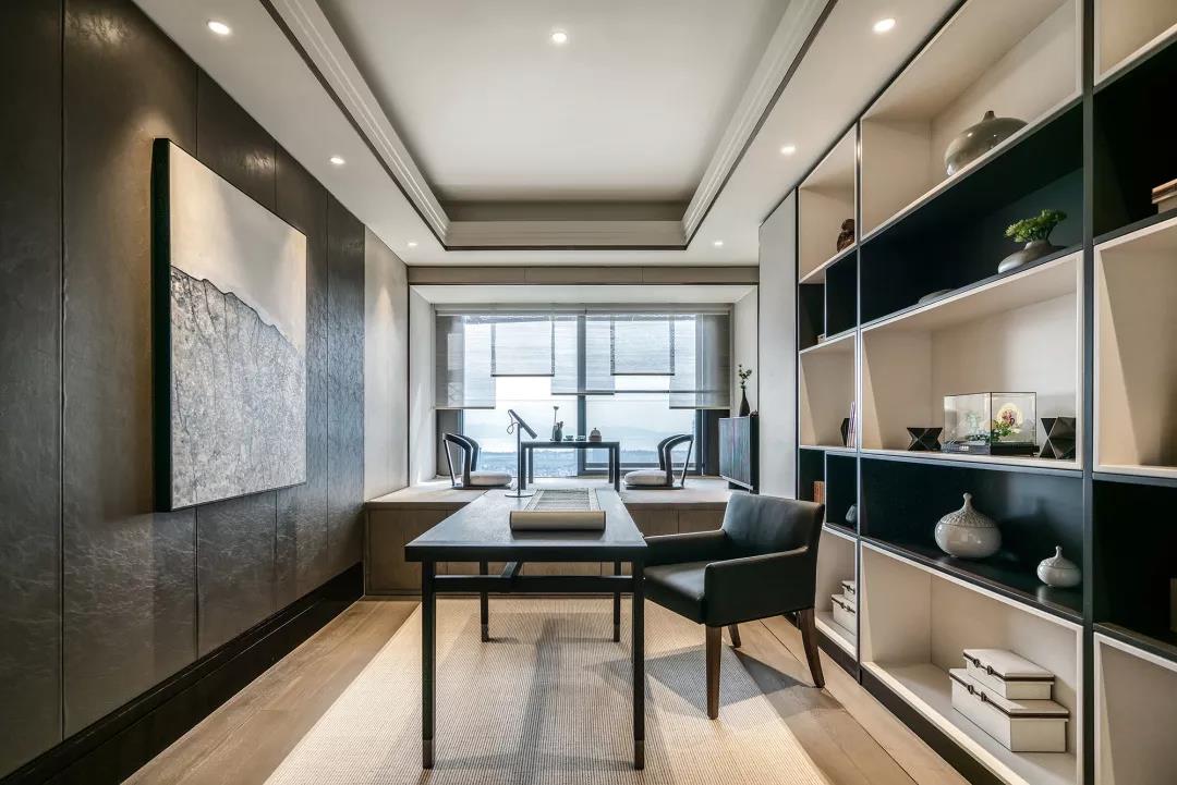 約64㎡的通透主臥套房設(shè)計(jì),以三進(jìn)的方式將書房、臥室、主衛(wèi)進(jìn)行構(gòu)設(shè),使空間具備更好的秩序感與私密性。書房以簡(jiǎn)凈的黑白色調(diào)對(duì)話,現(xiàn)代極簡(jiǎn)語(yǔ)匯與中式情韻在空間中相融相生,分外靜雅。飄窗區(qū)被設(shè)計(jì)為茶室,原木、清茶、松葉、花卉交匯在一起,清甜而微香。晨間的日光柔和,夜晚的月色明澈,一杯清茶,共待流年。