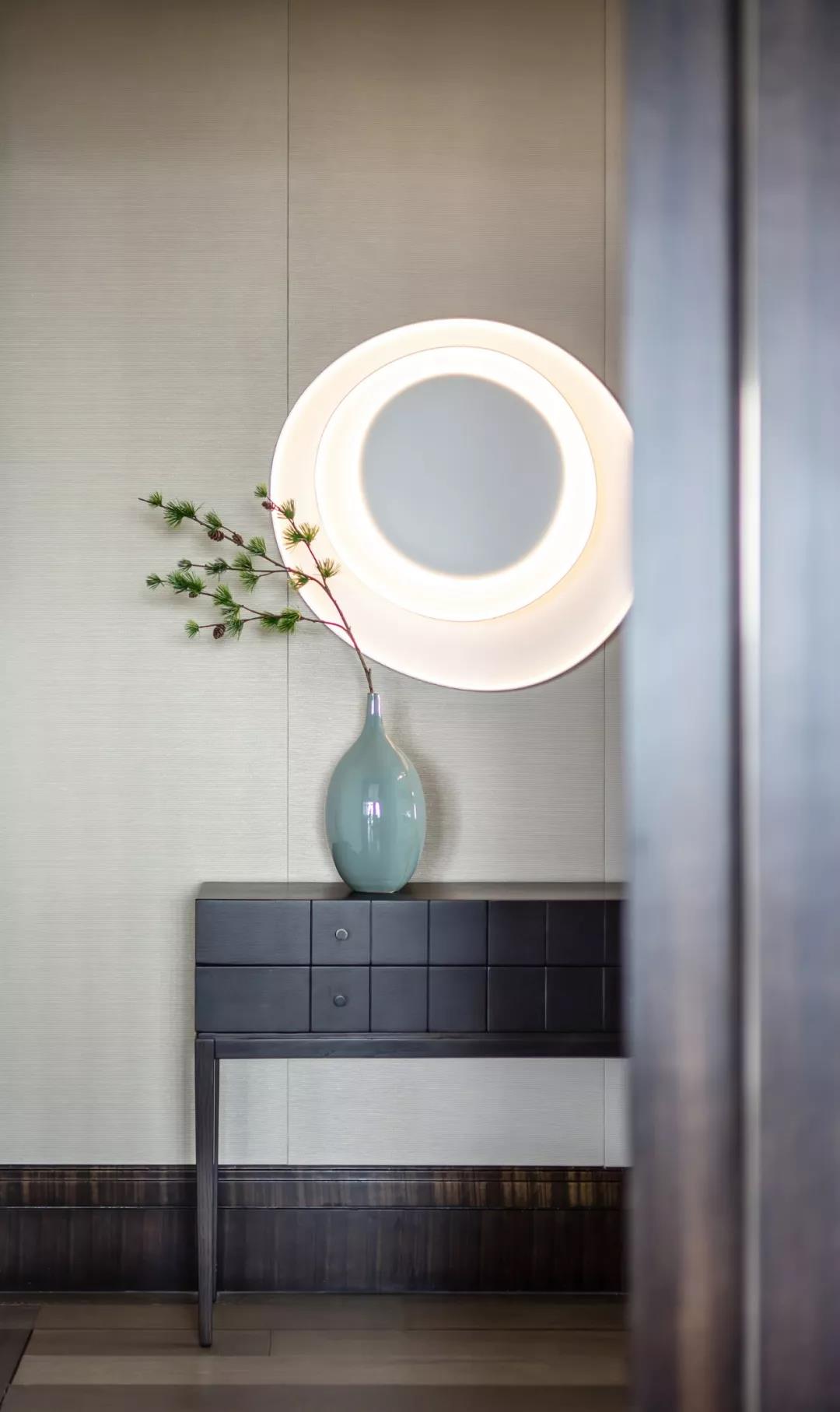 踏入家門,映入眼簾的是絹絲手繪屏風(fēng),寥寥數(shù)筆寫意了一幅“小荷才露尖尖角,早有蜻蜓立上頭”的生動(dòng)場(chǎng)景。白天,明媚的陽(yáng)光灑進(jìn)來,讓人產(chǎn)生小池、微風(fēng)與荷葉田田的自然聯(lián)想。夜晚,當(dāng)忙碌一天的男主人回到家里,在溫煦的燈光下,空氣中的靜逸與幸福感足以驅(qū)走一天的疲憊。