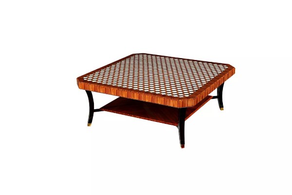 此次獲獎(jiǎng)的大方幾(Al-1620-3),其主材精選桃花芯實(shí)木,臺(tái)面采用天然酸枝木皮和天然影木皮做特殊染色處理,運(yùn)用2688塊小木皮無縫拼接出448個(gè)3D梯形幾何形,使之在視覺呈現(xiàn)上達(dá)到從360度任意角度觀看都是一個(gè)完美的3D幾何形。