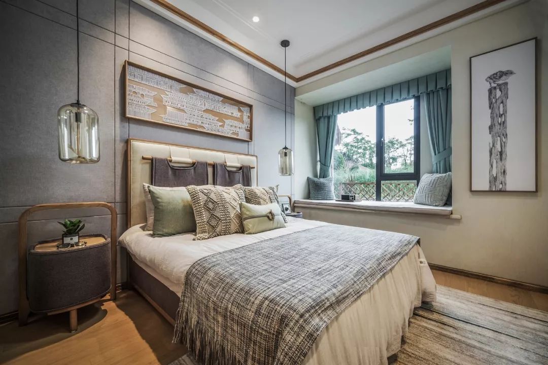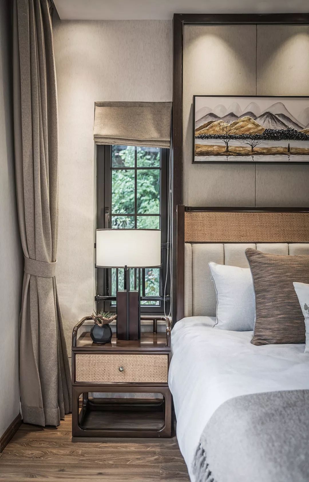 富有沉淀感的木的質(zhì)感帶來一室的安寧,床頭背景的玻璃開窗亦讓靜雅的空間煥發(fā)靈動的生氣,戶外的蔥翠伸手便可觸及,山野的芬芳在流動的空氣里盡情釋放,自由的靈魂得此安放。