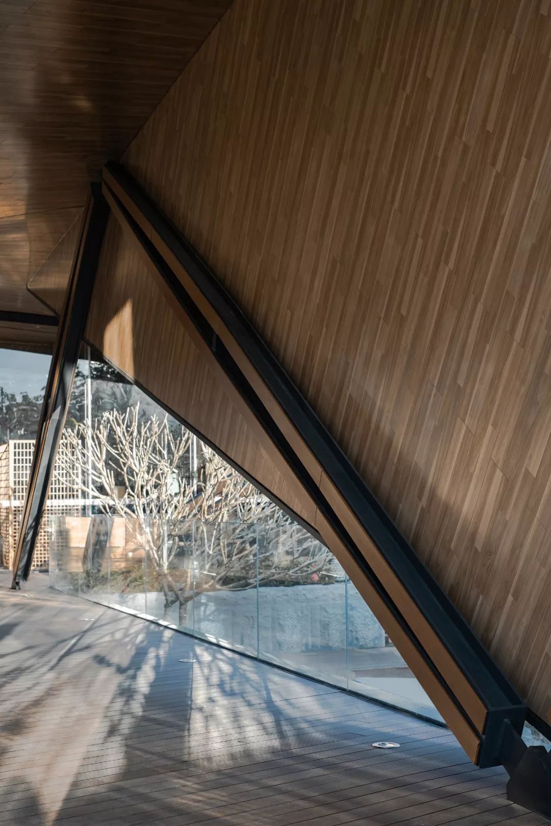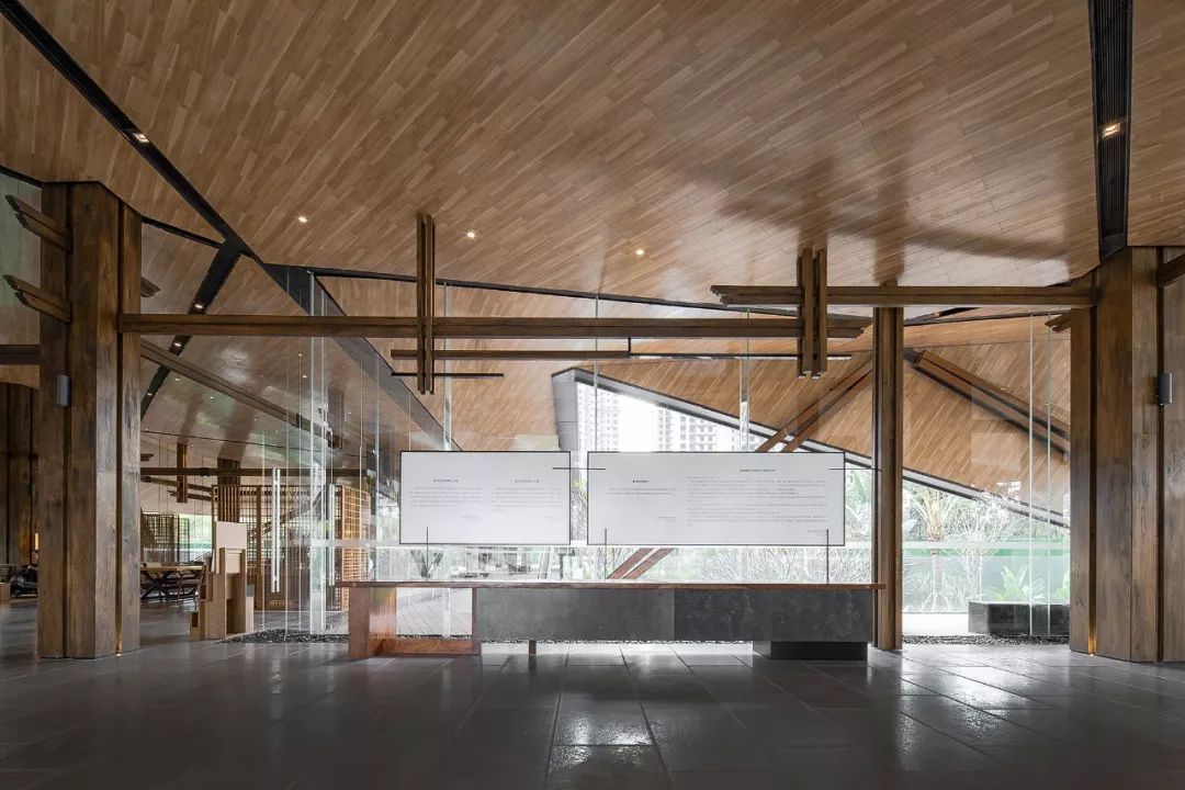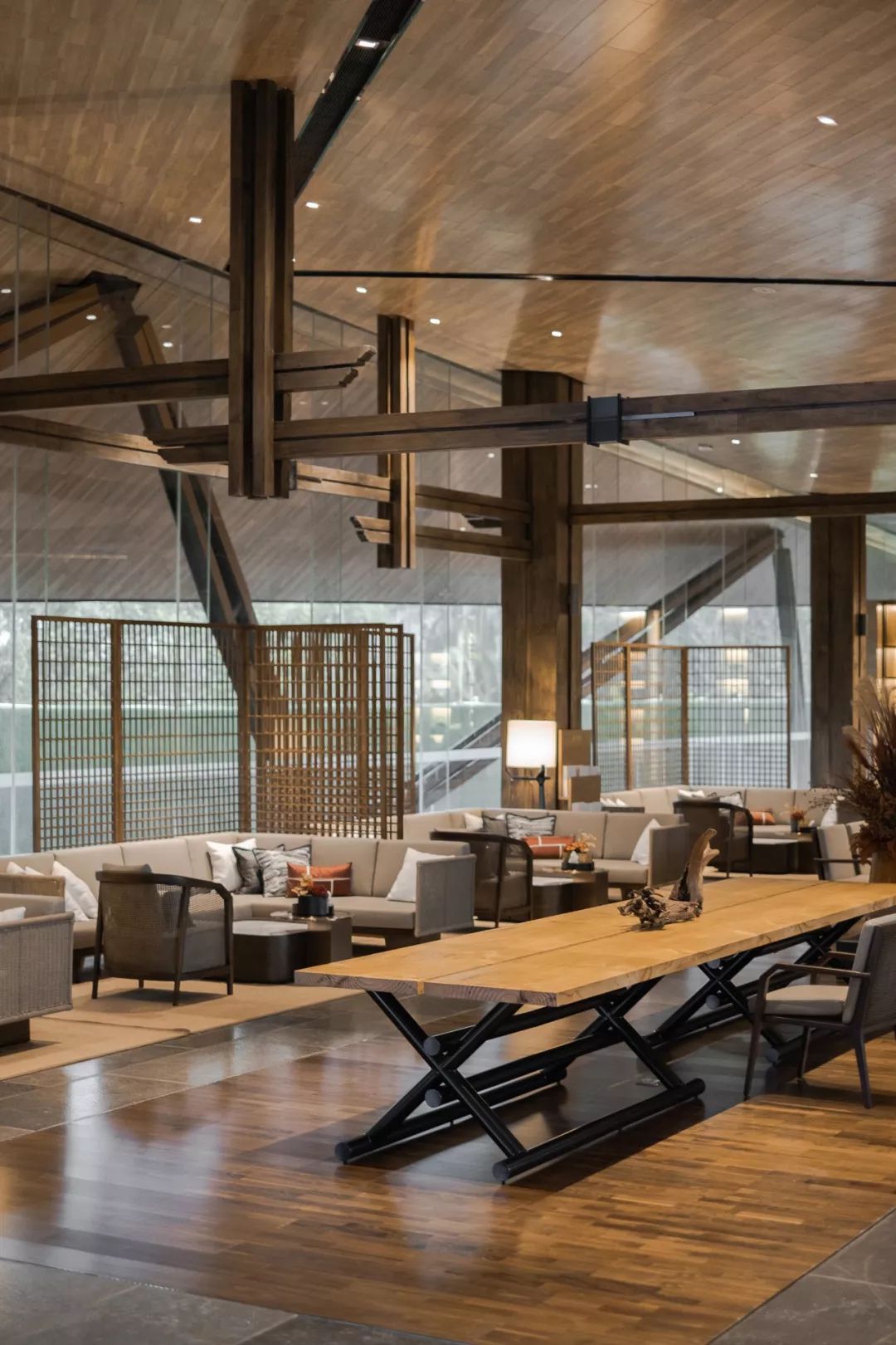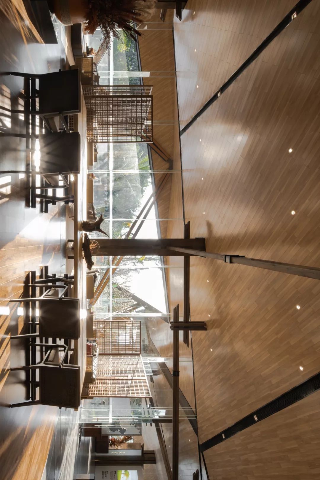 建筑設(shè)計通透開放,自由的屋頂結(jié)合靈活的異形結(jié)構(gòu),同生機勃勃的自然環(huán)境相融共生。室內(nèi)延續(xù)建筑所賦予的意義,以其為載體,在室內(nèi)空間延展、重組,詮釋其所構(gòu)成的涵義。
