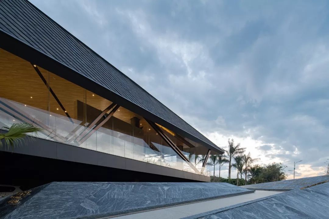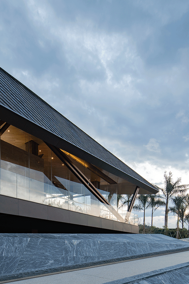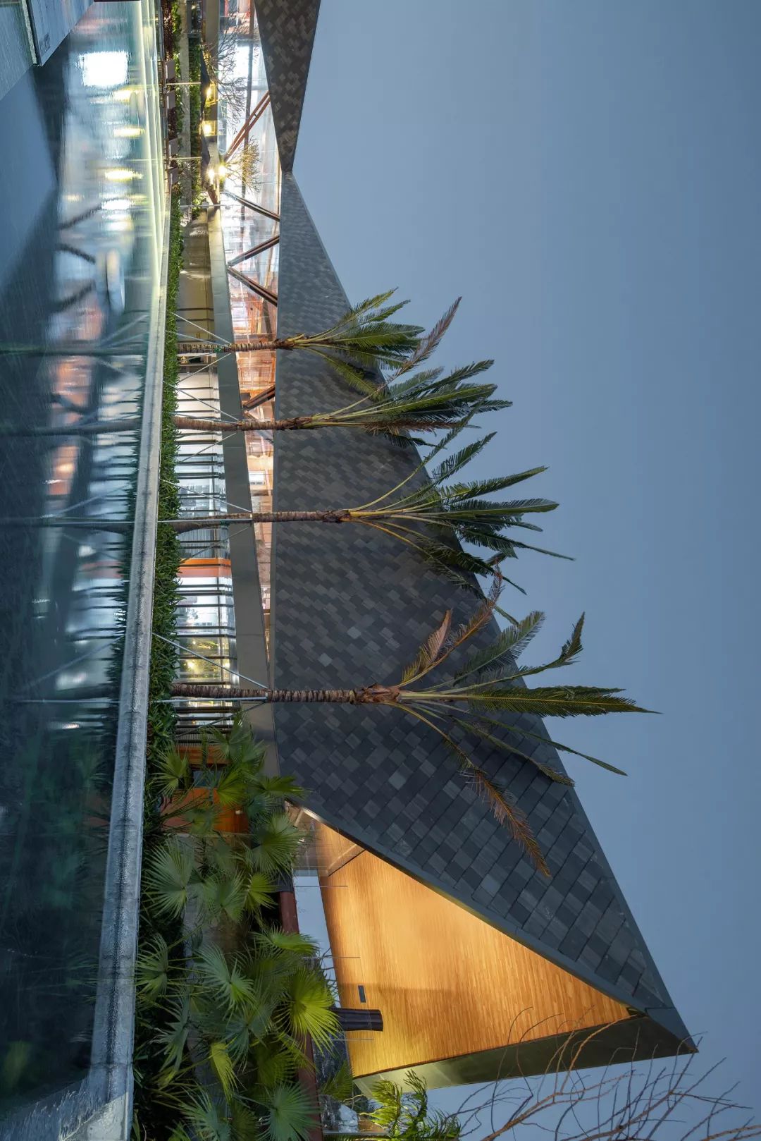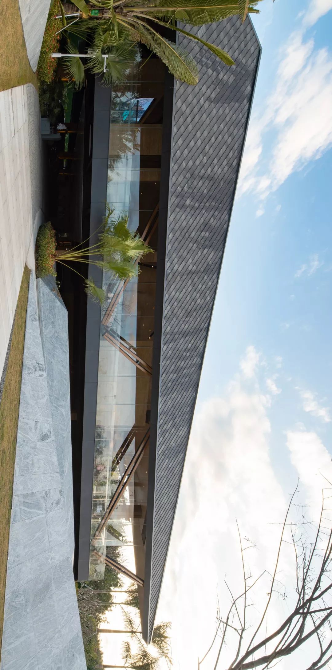 建筑設(shè)計通透開放,自由的屋頂結(jié)合靈活的異形結(jié)構(gòu),同生機勃勃的自然環(huán)境相融共生。室內(nèi)延續(xù)建筑所賦予的意義,以其為載體,在室內(nèi)空間延展、重組,詮釋其所構(gòu)成的涵義。