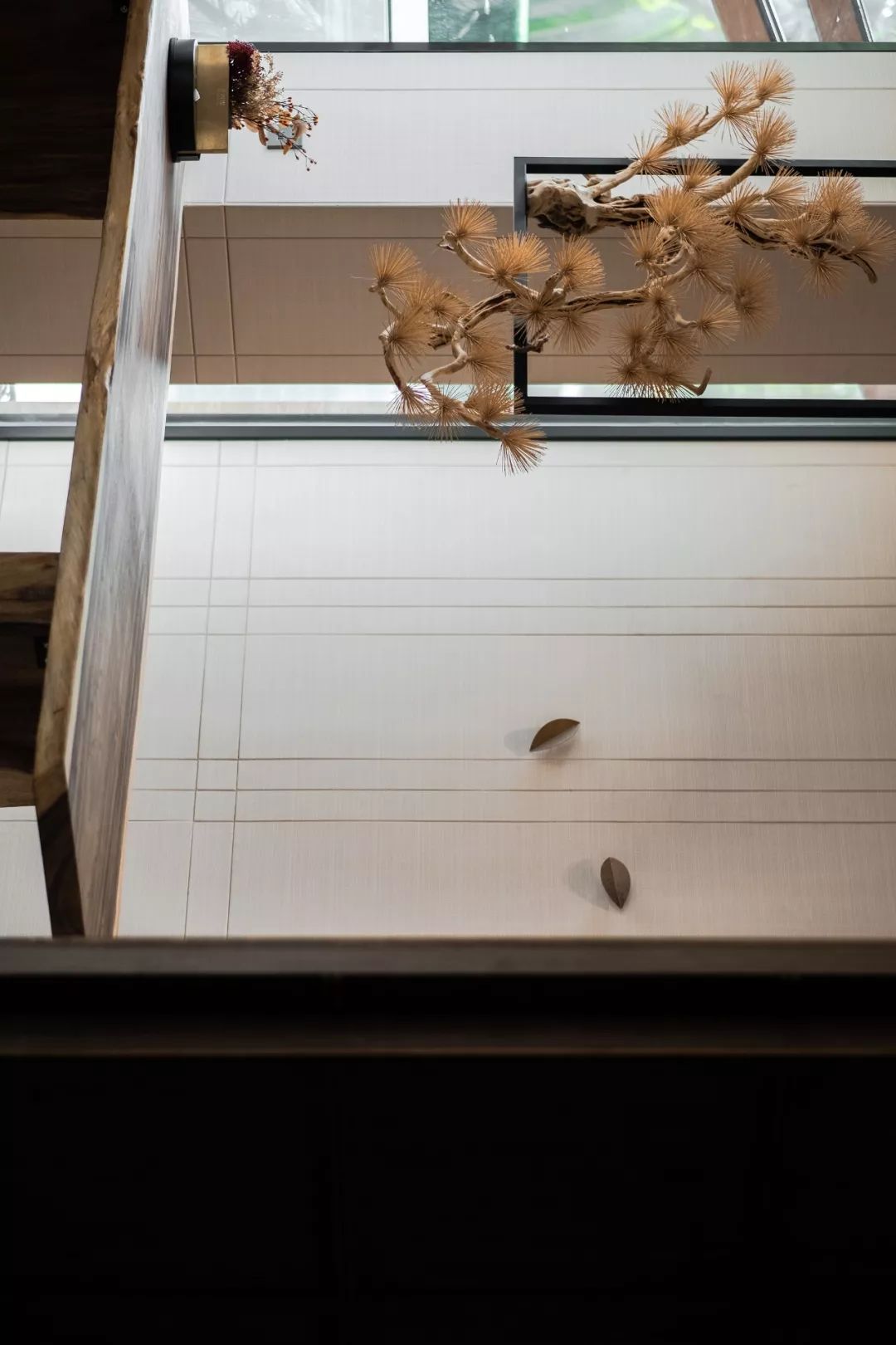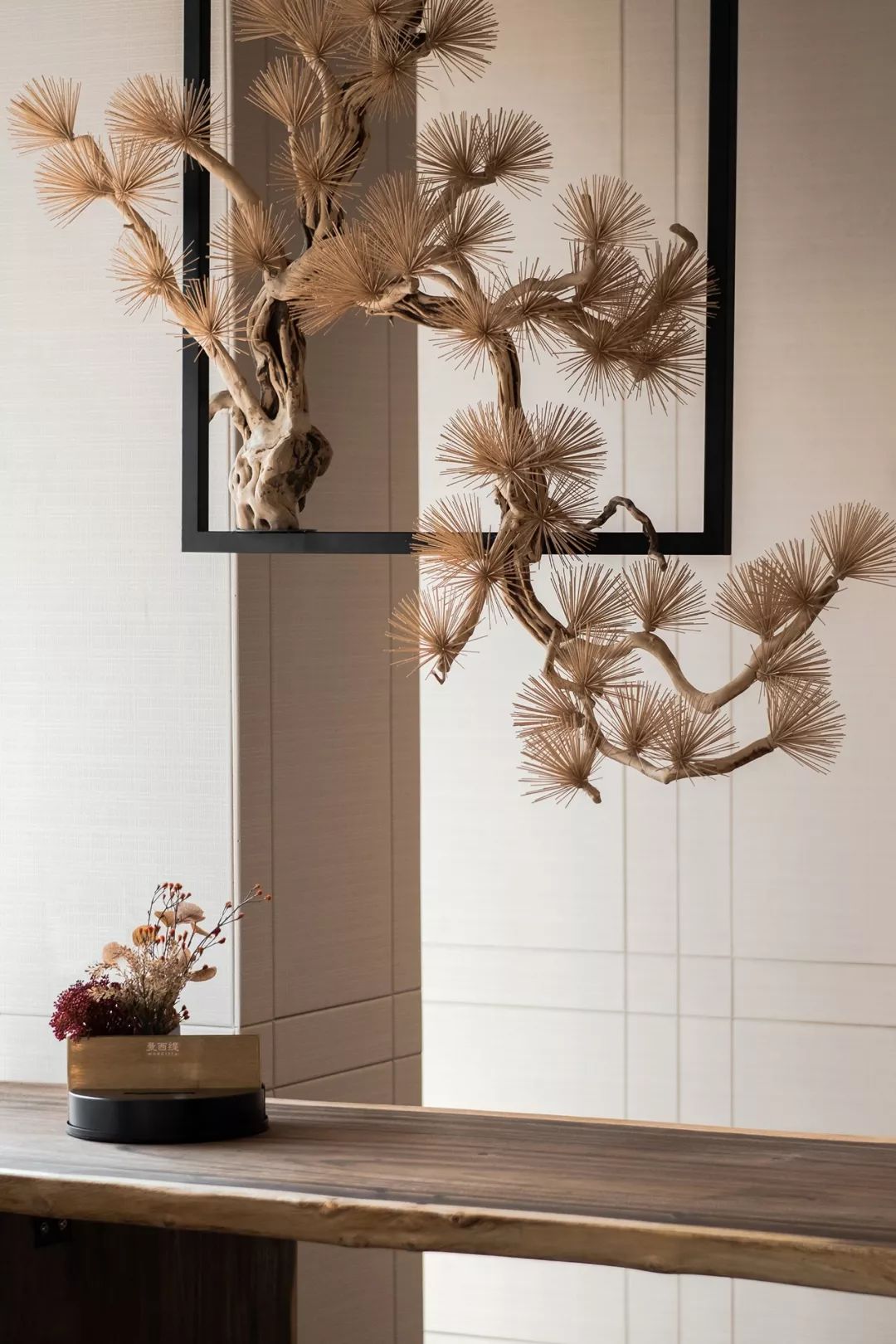 花藝設(shè)計恣意生長的枝椏和室外山水呼應(yīng),涵納和包容了自然之美,有限的內(nèi)部空間和無限的室外空間自然滲透與交流,虛實相生,人在其中,亦演變成參與者,并最終成為藝術(shù)的一部分。