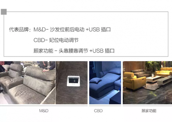 當然,智能家居不僅在寢具領(lǐng)域,沙發(fā)產(chǎn)品也沒有落下。例如沙發(fā)電動功能位的出現(xiàn)更加頻繁,并且變化的范圍更多,除了傳統(tǒng)的腿部抬高功能外,開始出現(xiàn)座位前后調(diào)節(jié)、上下調(diào)節(jié)的功能;通過功能五金以及與遙控裝置的對接,頭靠與腰靠的調(diào)節(jié)更加多元及便利;USB等智能接口全面普及等等。