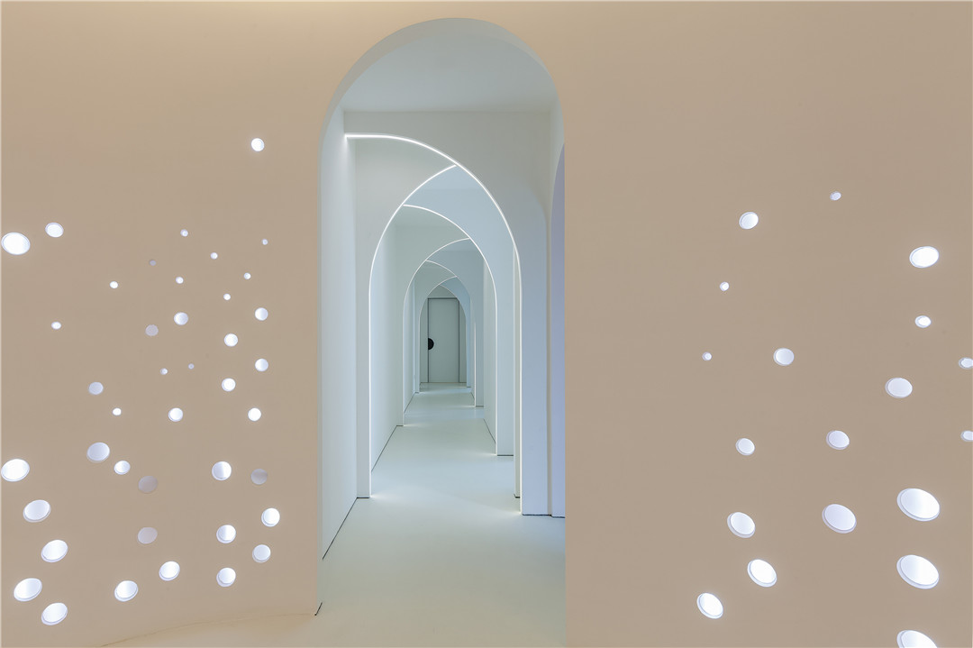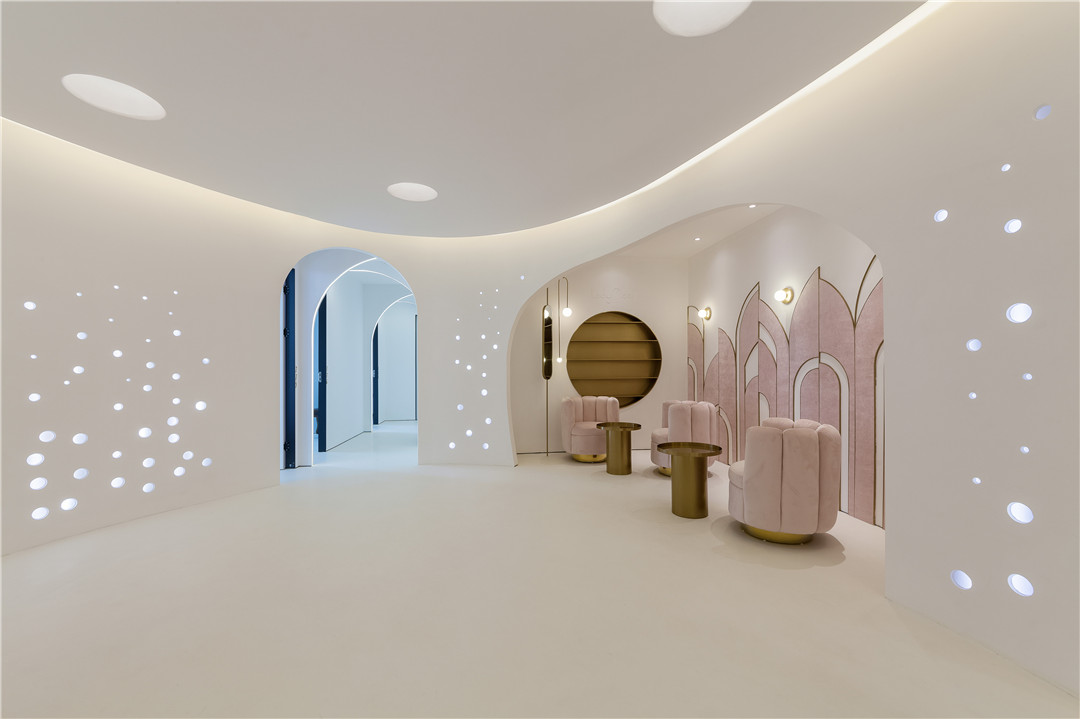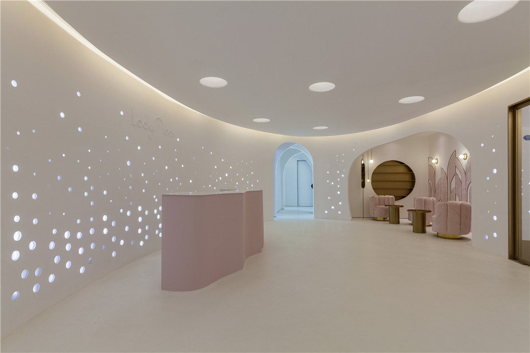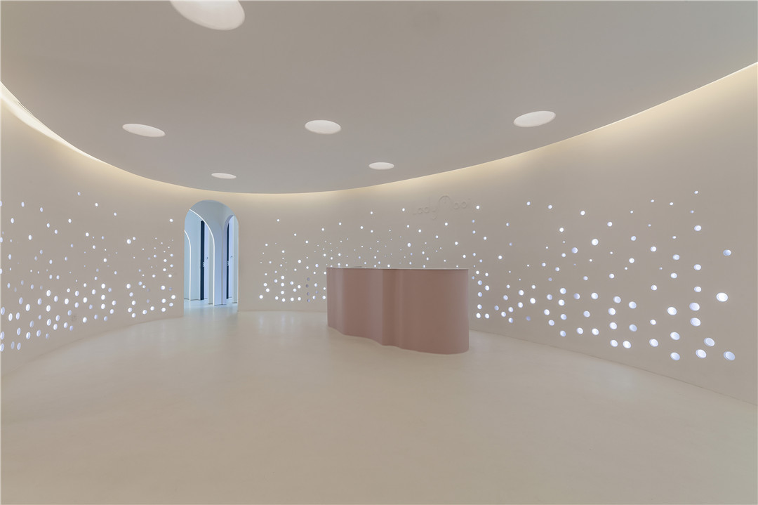 本次獲獎(jiǎng)作品《lady mooi 女子醫(yī)療美容機(jī)構(gòu)》其靈感源自兩歲女兒的睡前故事,設(shè)計(jì)摒棄了以往該類型空間所采用的慣常的符號(hào)化做法,以“人魚公主”的故事為設(shè)計(jì)靈感,提取氣泡、水等夢(mèng)幻元素,營(yíng)造輕松、舒適、浪漫的環(huán)境,讓愛(ài)美的顧客們?cè)谶@里有仿佛置身夢(mèng)幻水世界的感受。一圈沖孔板從下往上、由大到小不規(guī)則排列,仿佛海底世界的氣泡,簇?fù)沓扇彳?、純凈的橢圓形空間。過(guò)道用燈帶鑲嵌半弧形攻門,錯(cuò)落之間,一步一世界,那份變身的莊重在魔法的推演中漸漸實(shí)現(xiàn)。