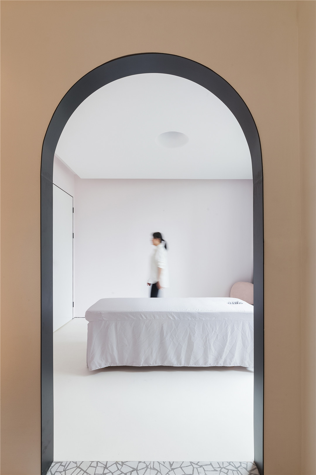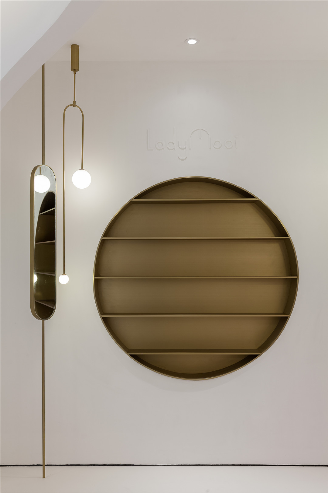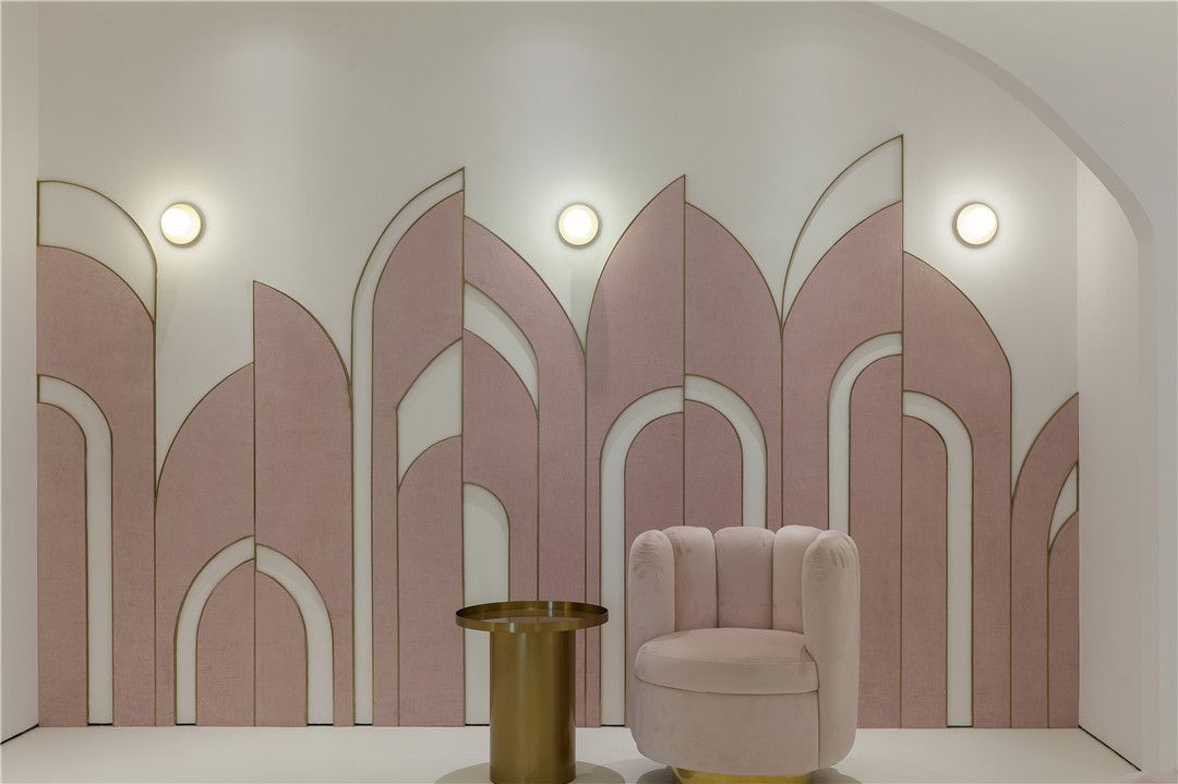 本次獲獎(jiǎng)作品《lady mooi 女子醫(yī)療美容機(jī)構(gòu)》其靈感源自兩歲女兒的睡前故事,設(shè)計(jì)摒棄了以往該類型空間所采用的慣常的符號(hào)化做法,以“人魚公主”的故事為設(shè)計(jì)靈感,提取氣泡、水等夢(mèng)幻元素,營(yíng)造輕松、舒適、浪漫的環(huán)境,讓愛(ài)美的顧客們?cè)谶@里有仿佛置身夢(mèng)幻水世界的感受。一圈沖孔板從下往上、由大到小不規(guī)則排列,仿佛海底世界的氣泡,簇?fù)沓扇彳?、純凈的橢圓形空間。過(guò)道用燈帶鑲嵌半弧形攻門,錯(cuò)落之間,一步一世界,那份變身的莊重在魔法的推演中漸漸實(shí)現(xiàn)。