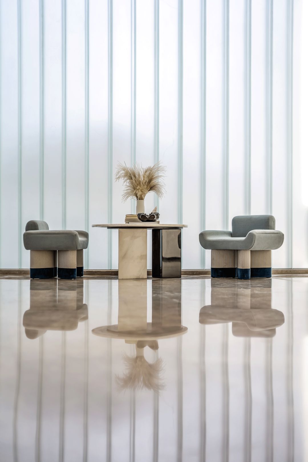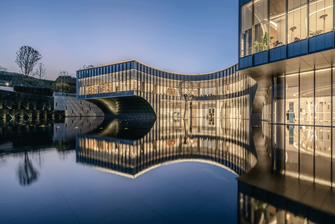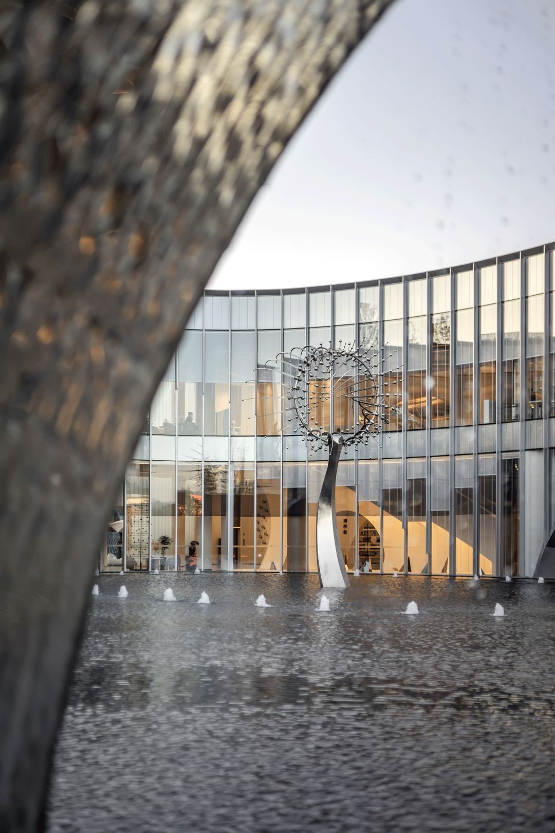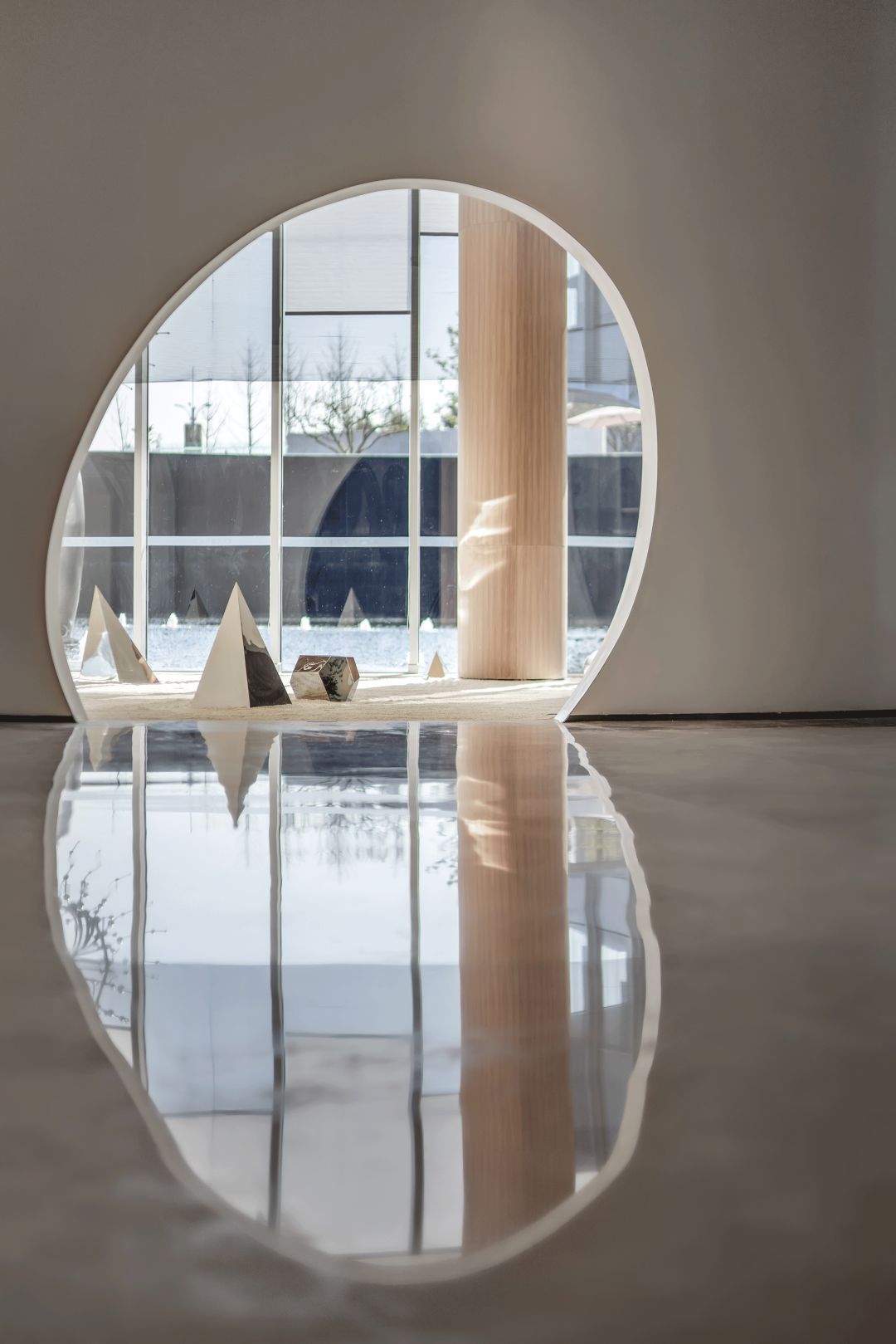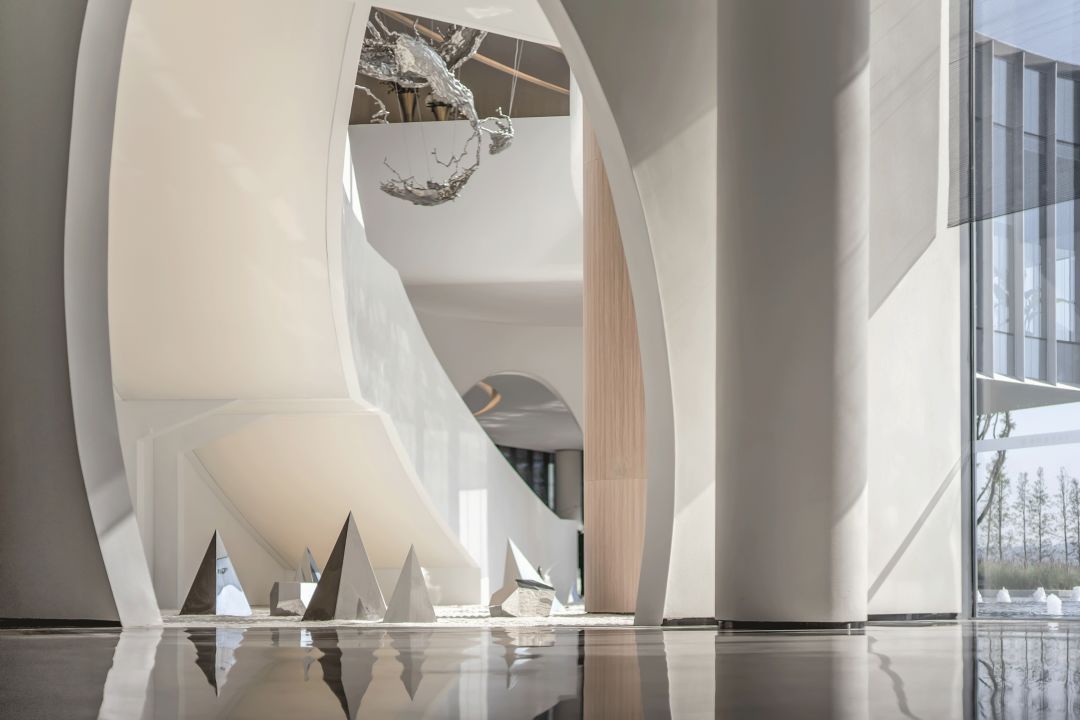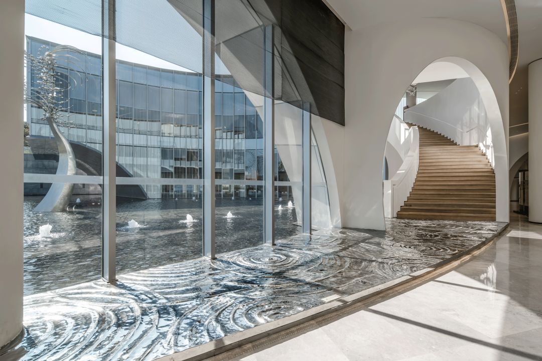 接待區(qū)就在這一理念之下,景觀以水之形態(tài)為伊始展開,而后又融入了似水也像風(fēng)的流動(dòng)意象,互相依融互不侵犯,這種結(jié)合東方元素的處理,又與建筑外觀的極盡現(xiàn)代形成對(duì)比。