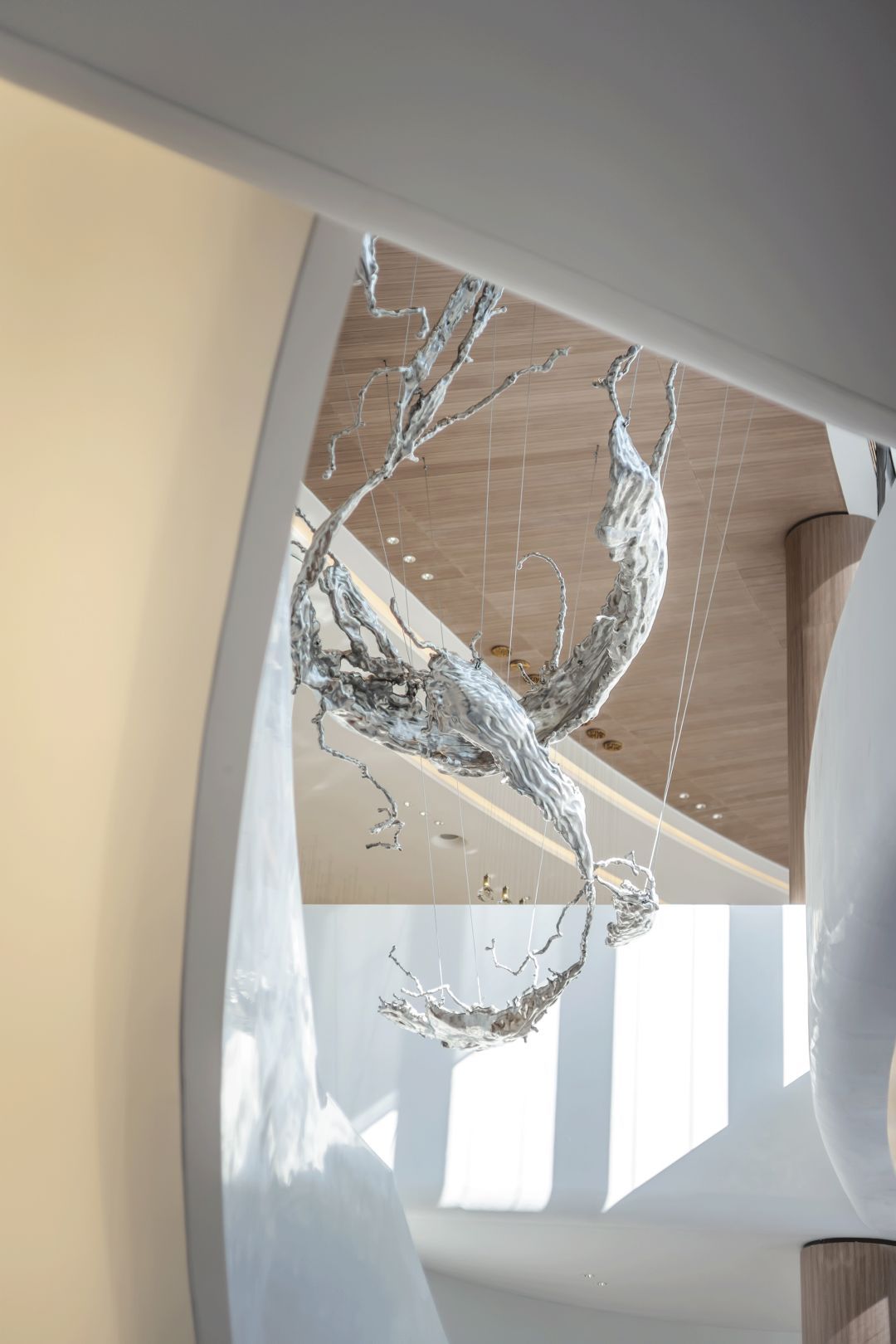 空間在完成硬裝設(shè)計(jì)后本身就具有了很好的水云造型及藝術(shù)性,因此藝術(shù)品的選擇變更具挑戰(zhàn),為了避免過猶不及,他們極力選擇抽象和具有想象力的藝術(shù)作品置入,貼合主題且在形態(tài)上活潑有生氣。