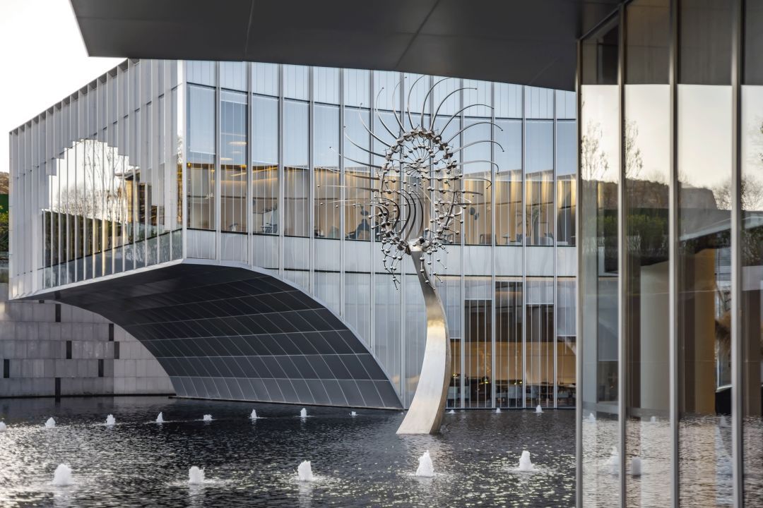 在樓梯間和水紋平臺(tái),都設(shè)計(jì)了大尺度不同形態(tài)展現(xiàn)水的藝術(shù)裝置,水花飛濺在空中,點(diǎn)點(diǎn)漣漪在腳下。
