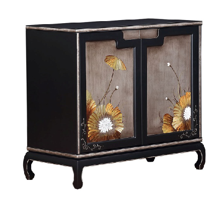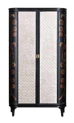 禹門高柜,大氣玄黑,氣勢(shì)高峨,左右漆部如兩山對(duì)峙,龍鱗從中游走穿行,銀光鱗鱗,迸濺出了神思飛動(dòng)的神傳仙界。彩繪極盡臻樸之色,秋菊之韻,仿若歷史的落花拾葉在墨池緩緩浸潤(rùn),玄幻之理,幽靜之骨,全積聚在一柜之上。