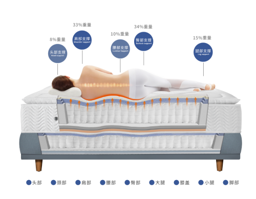 大家都知道寢具最關(guān)鍵的就是:彈性支撐系統(tǒng)。有彈性才能將身體較重或凸起部位(如肩膀、臀部)對(duì)床的“下推力”,主動(dòng)轉(zhuǎn)變?yōu)?ldquo;反推力”,以支撐身體其他較輕或凹陷部位(如腰部、腿部),其靈活多向的反應(yīng)特性,無(wú)論男女老少,高矮胖瘦,何種睡姿,都可以依據(jù)人體各部位曲線及重量不同,自動(dòng)提供舒適、健康的睡眠生理曲線。
