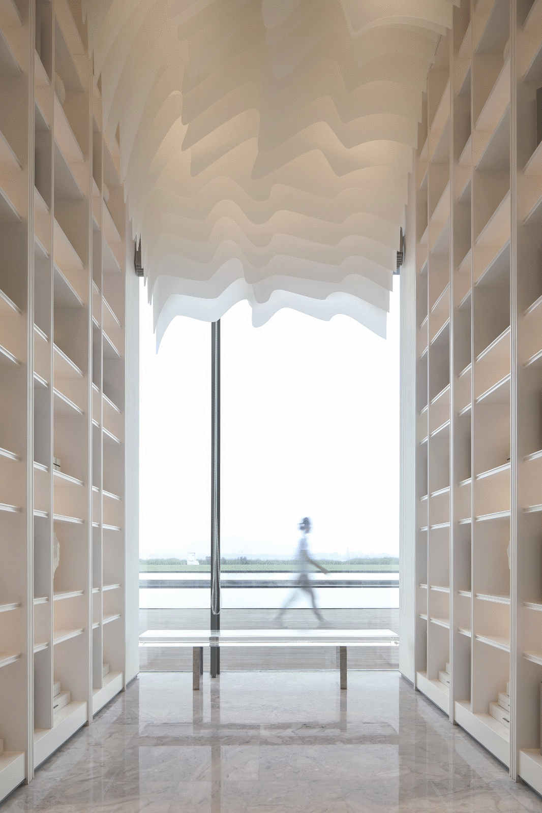 從沙盤區(qū)經(jīng)展廳至休息區(qū),開闊的視野望出去,山、水、田野皆入眼底。一窗之隔,黑白或漸變的顏色,極簡的筆觸勾勒出讓人寧靜的幾何線條。天、地與人的和諧, 在厚重的山石與靜淌的流水間滲透,動(dòng)與靜,柔與剛,于空間之中靜默交流。