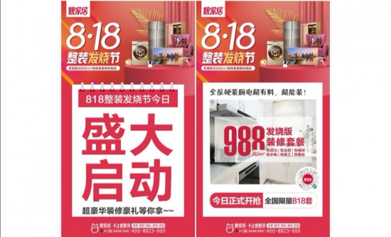如“818整裝發(fā)燒節(jié)”主推的988元/㎡發(fā)燒版裝修套餐、39900元全屋定制軟裝套餐、988元/㎡舊房翻新版套餐。