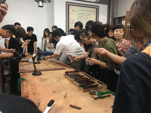 第三站:實地參觀龍順成“京作”家具制作各工序,并由龍順成“京作”家具制作傳承人結(jié)合不同工序的特點進行現(xiàn)場解說及演示。作為京作硬木技藝的核心,以不用一根鐵釘拼接、能使成百上千年而在人類輕工制造史上堪稱奇跡。