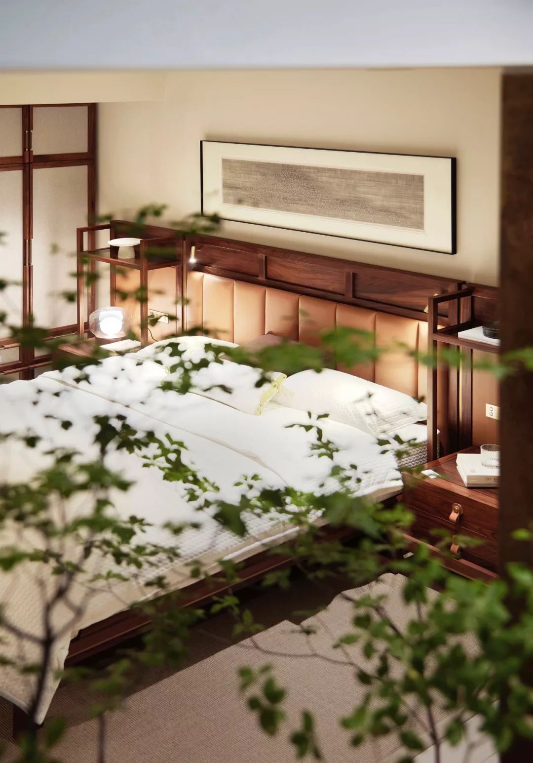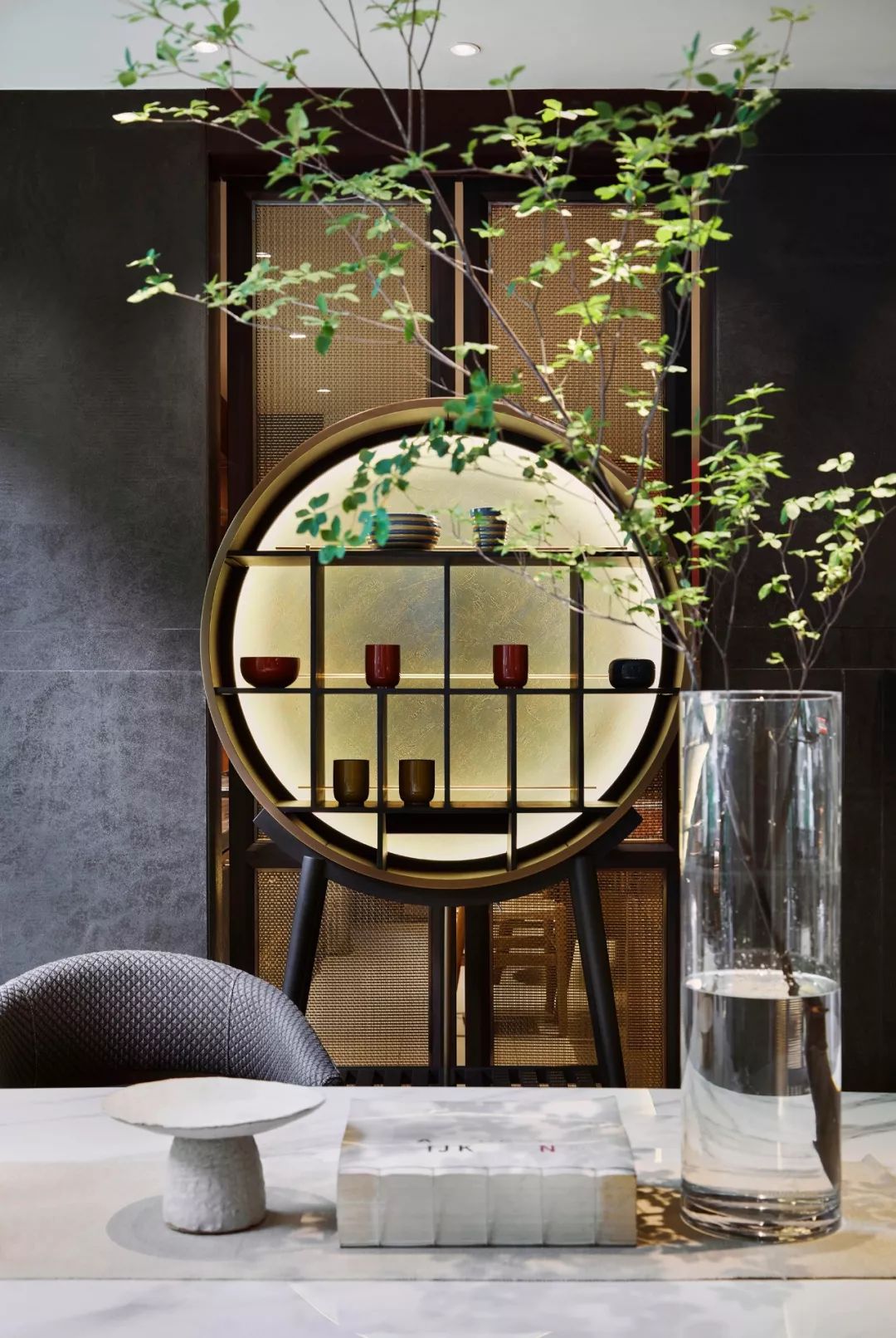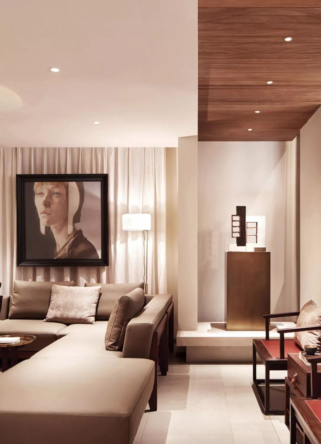 朱子將床具延伸成組合套系,搭配上,他亦不拘泥于傳統(tǒng),淡灰色大理石搭配駝色真皮、調(diào)性銅件、暖調(diào)實木,予人的美學(xué)觀感是細膩雅致的,東方氣韻于室內(nèi)流淌,摩登格調(diào)躍然于精致細節(jié)之上。