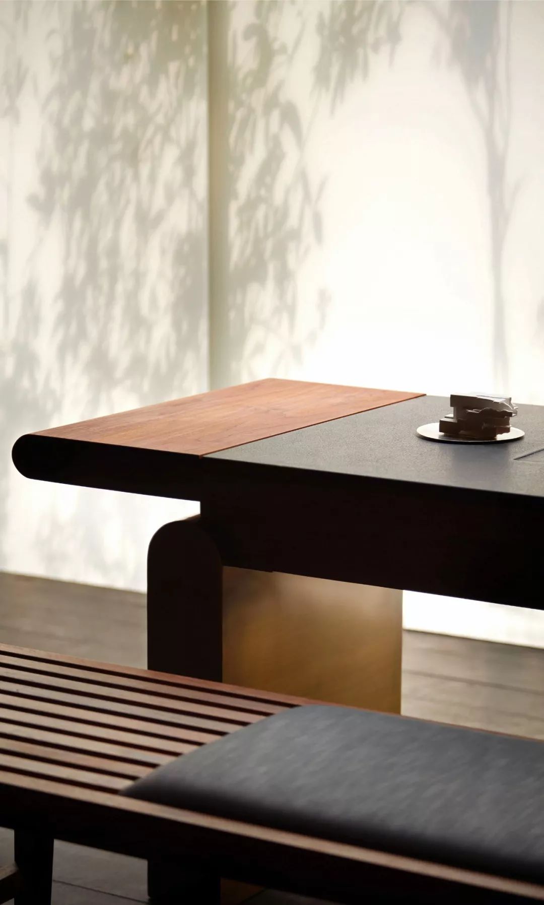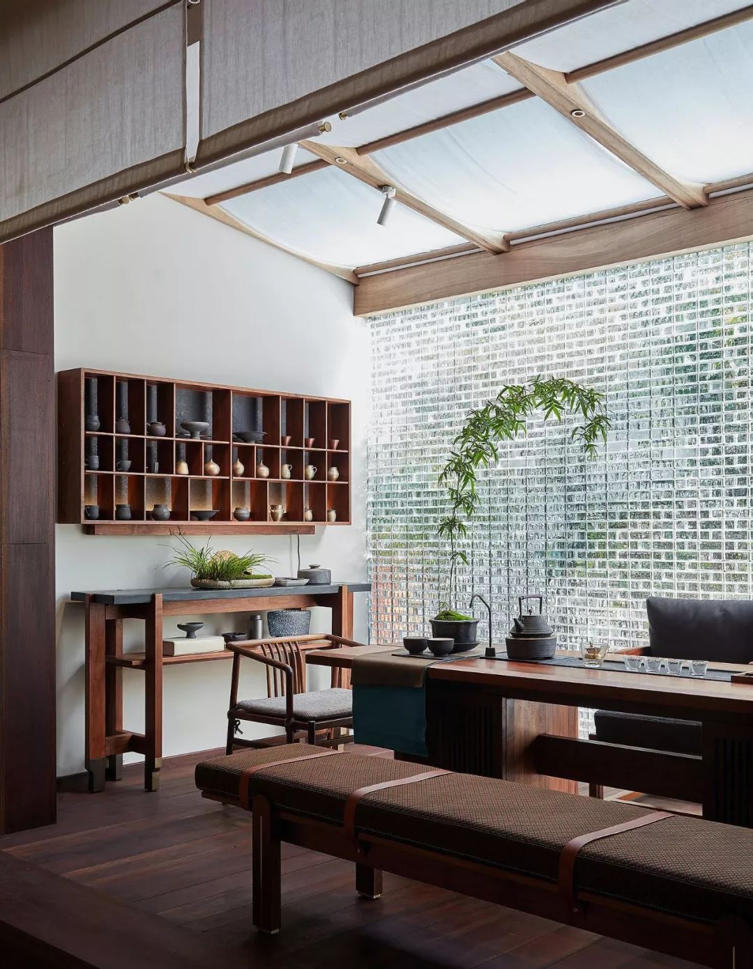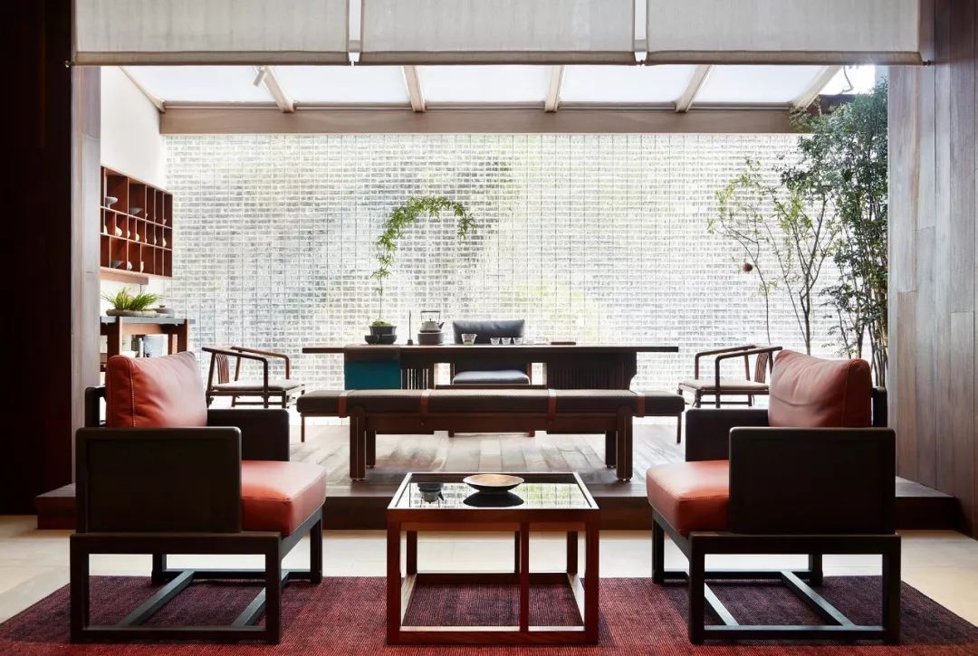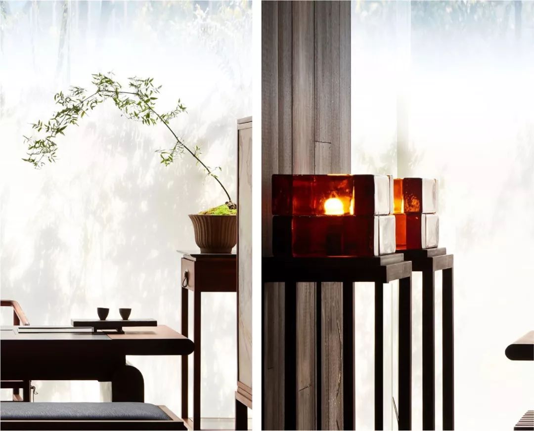 閑聊之后,朱子會帶著客人來到他最鐘愛的茶室,茶室以透明方磚壘就一面與外界朦朧對話的隔斷,陽光清透、樹影斑駁、疏雨潺潺等景致與四時時光常在。歲集茶桌、茶柜、茶具兼具功能與美學(xué),匹配以茶會友雅事之氛圍。