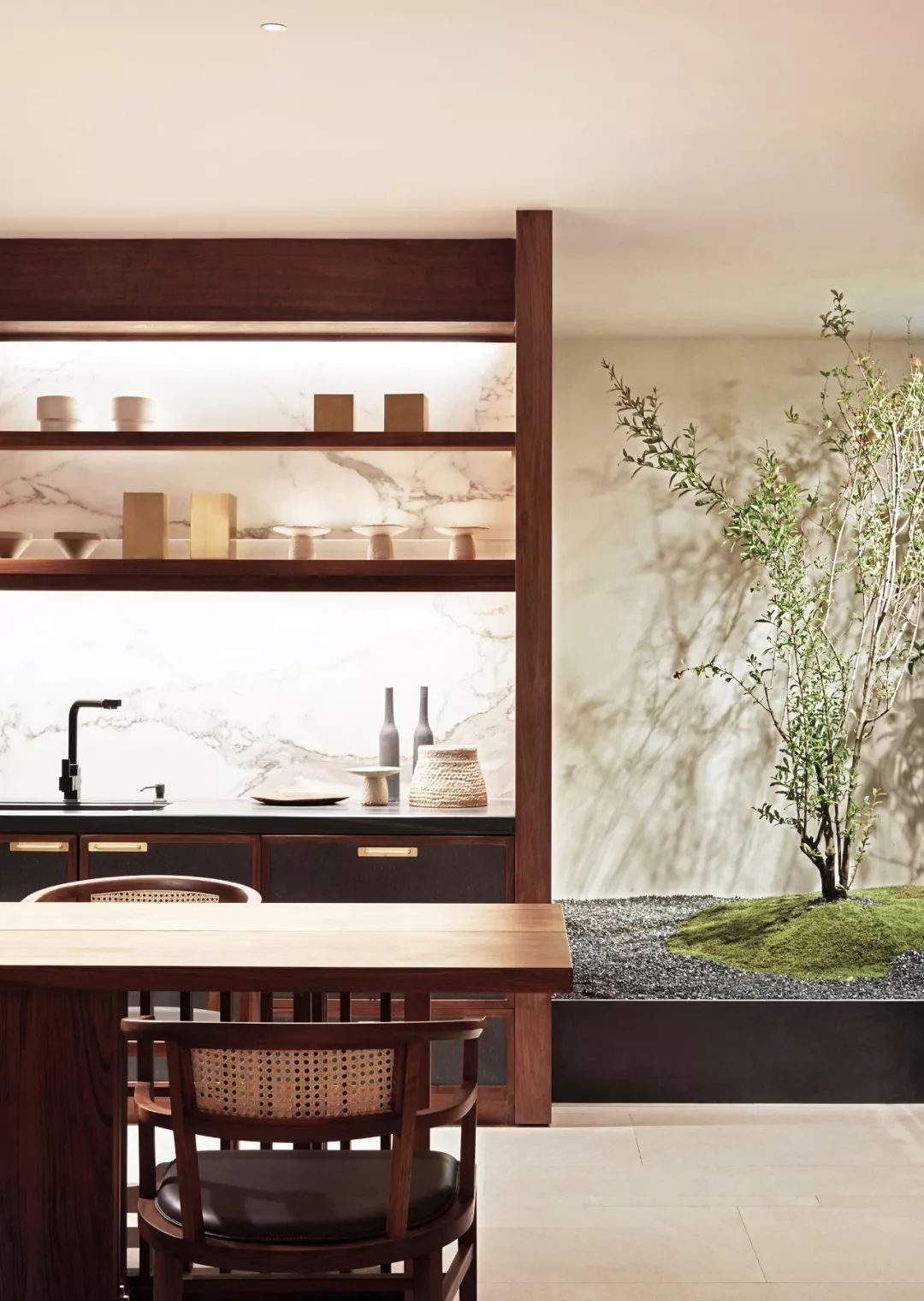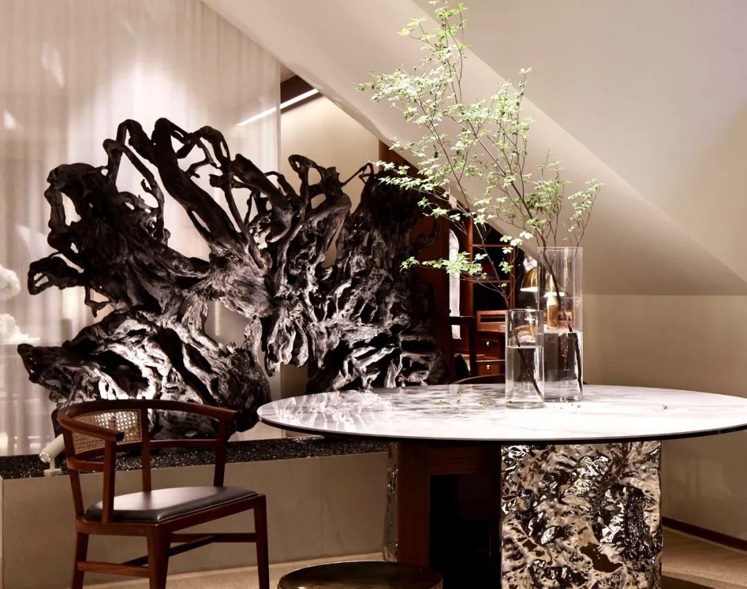 這是他強調(diào)了一遍又一遍的歲集的東方感,所以他的空間里有西方的壁爐,也有抽象當(dāng)代的雕塑,甚至有他和太太在日本淘回來的手作陶藝。