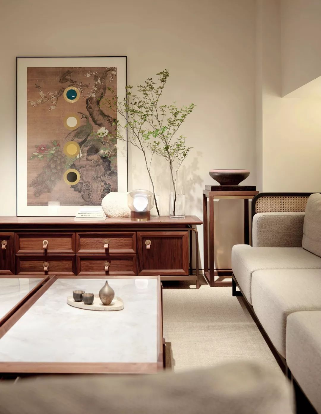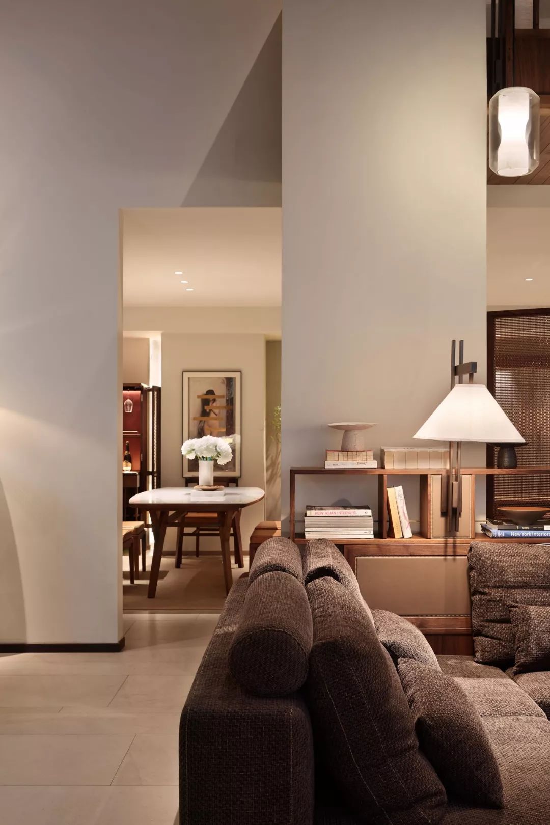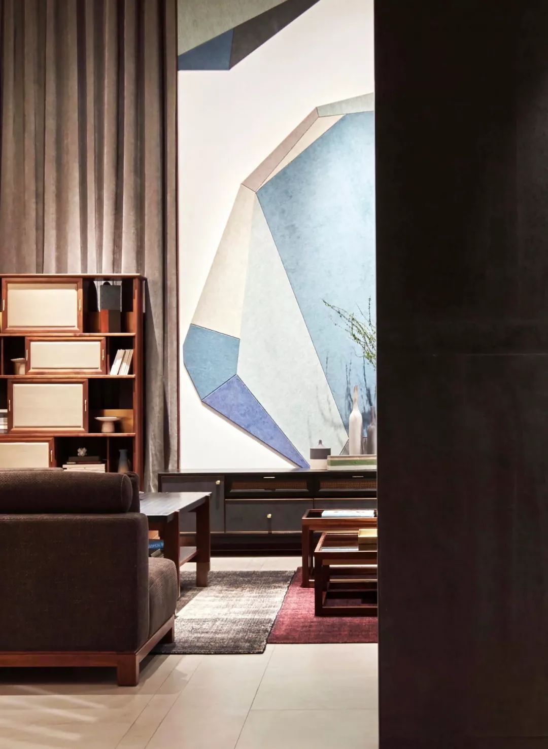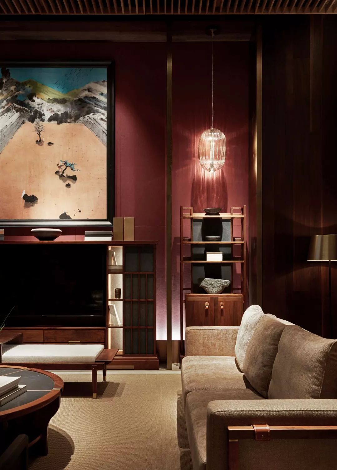 灰調(diào)、棕調(diào)、朱調(diào)與墨調(diào)的木藝家具以東方氣質(zhì)為基調(diào),采用榫卯結(jié)構(gòu)的木作框架,搭配藝術(shù)畫與燈飾,呈現(xiàn)一種“閑曠以自適”的姿態(tài),自信有度地營造出客廳這一休閑場域生動的日常。