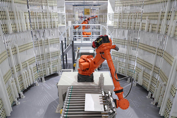 中控室是整個車間的“大腦”,通過這里可以了解到整套生產(chǎn)系統(tǒng)的情況與數(shù)據(jù)。整個智能化生產(chǎn)過程從立體原料倉庫開始。倉庫的貨架要比一般的高得多,充分利用垂直的空間來存放原材料。值得一提的是,這里這里生產(chǎn)過程中主要采用是索菲亞的環(huán)保板材——康純板。