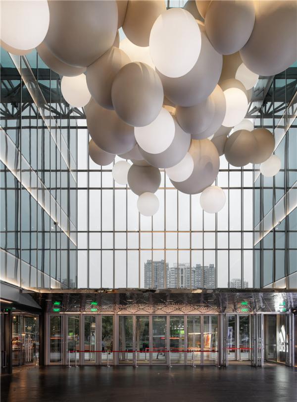 本案的燈光設(shè)計(jì),便是延續(xù)了建筑的風(fēng)格與氛圍定位,在結(jié)合中庭自然光線的基礎(chǔ)上,設(shè)計(jì)師打造一個(gè)橫貫中空格局的大型燈飾藝術(shù)裝置,堆疊的白色球狀燈體與飾物渾然一體,串聯(lián)起空間內(nèi)最為突出的視覺(jué)重點(diǎn),散發(fā)著瑩瑩點(diǎn)點(diǎn)、皎潔明朗的光芒,展呈出迭代美學(xué)視像的感官效果,與建筑體量、室內(nèi)氛圍極佳地結(jié)合在一起。
