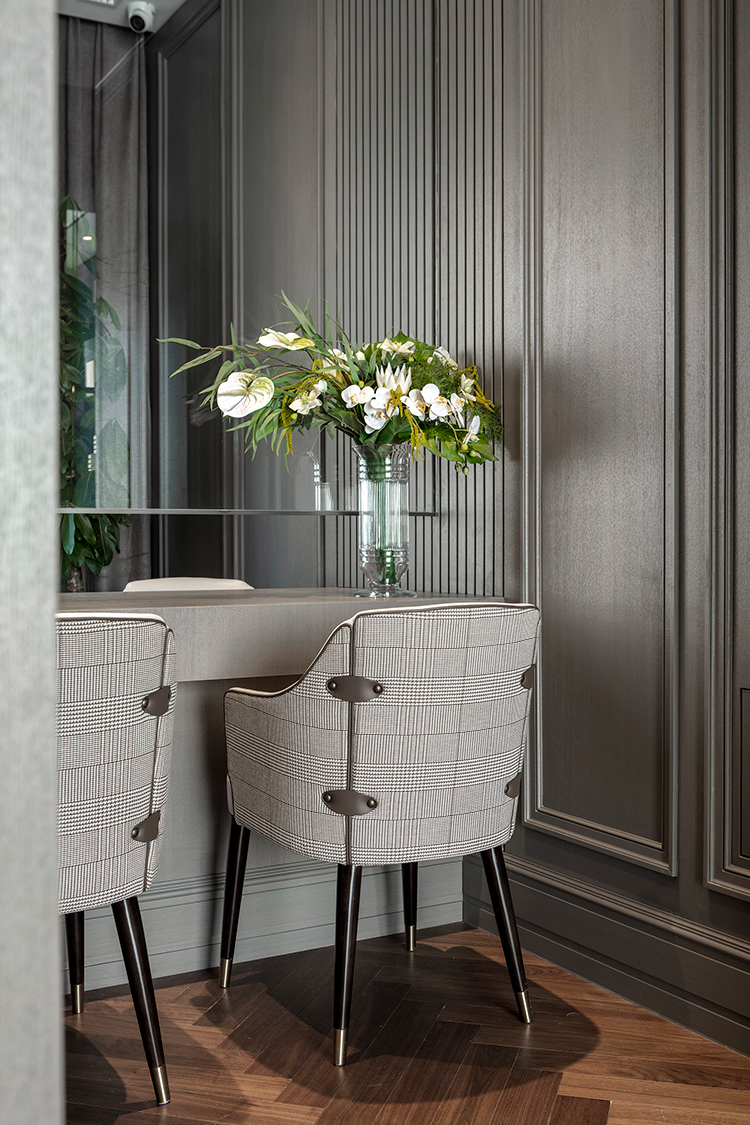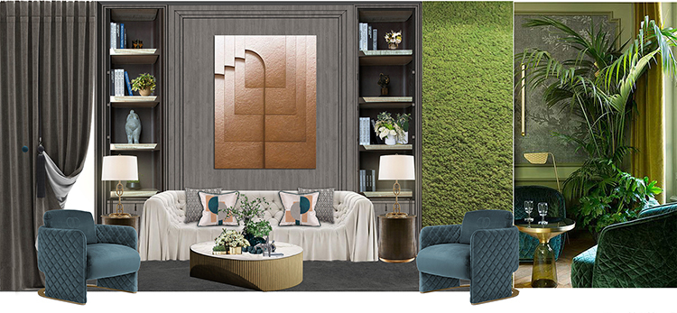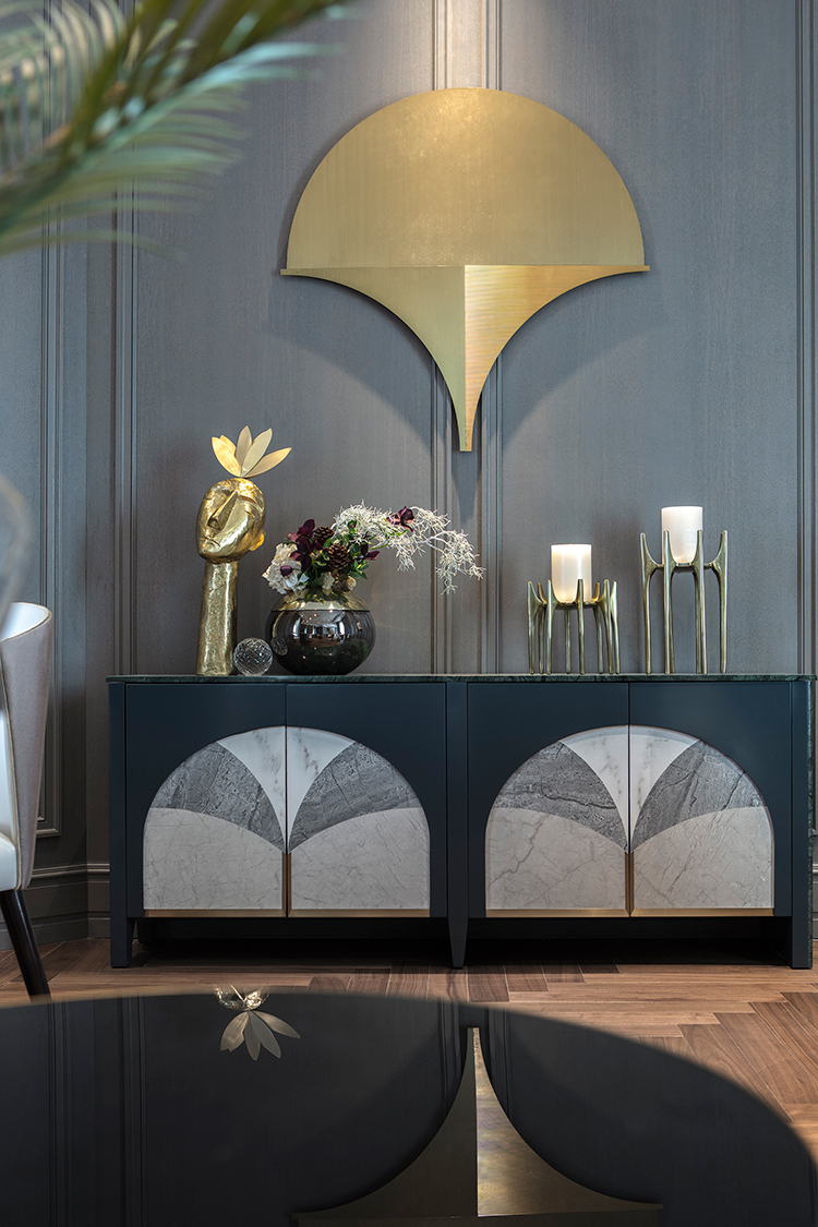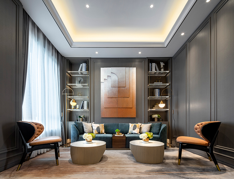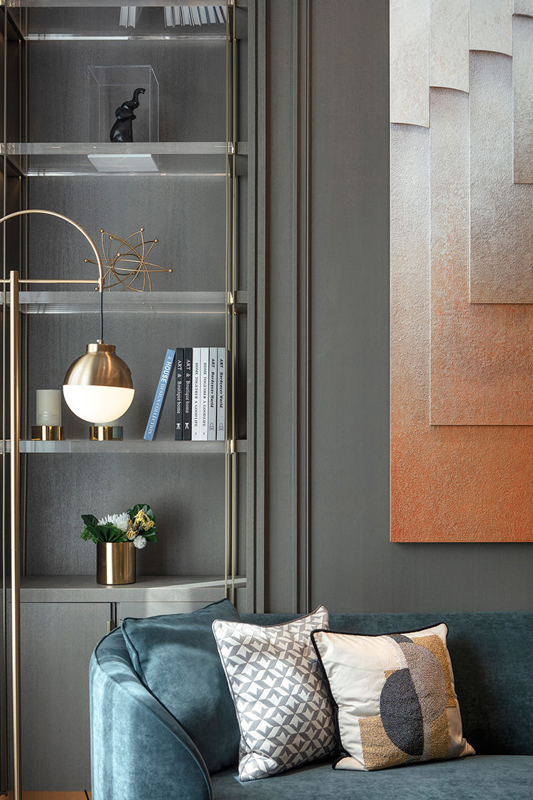 設(shè)計(jì)師靈活運(yùn)用線條的裝飾性,續(xù)寫Art Deco的美學(xué)意趣??臻g中運(yùn)用的復(fù)古藍(lán)折疊捫布?jí)?、鉚釘矮幾、皮質(zhì)沙發(fā)組、花藝綠植,無論是在工藝、細(xì)節(jié)還是品質(zhì)上,均詮釋了精致的藝術(shù)內(nèi)涵,于優(yōu)雅中透露現(xiàn)代時(shí)尚的觀感。
