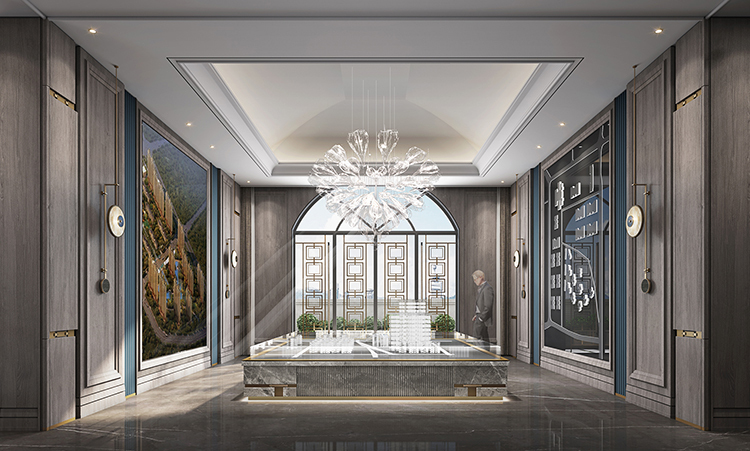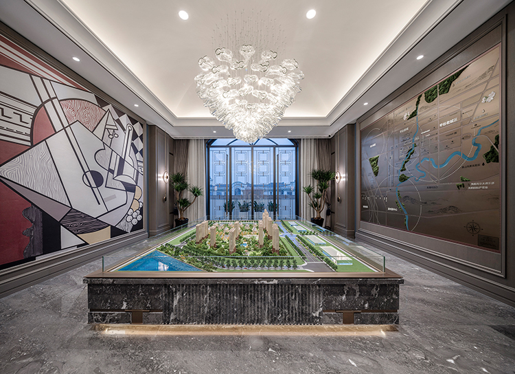 沙盤區(qū)在優(yōu)雅灰的基調(diào)下,波普色彩與抽象藝術(shù)融粹的巨幅掛畫成為空間兩側(cè)的視覺落點(diǎn),對(duì)照著中心的沙盤模型區(qū),水晶燈飾的清透雅意傾灑一室??臻g中有著繁雅紋理的落地玻璃門窗,加之綠植的局部映襯點(diǎn)綴,混搭出清晰可感的格調(diào),既有古典摩登的秩序性,又不失簡美大方的體驗(yàn)感。