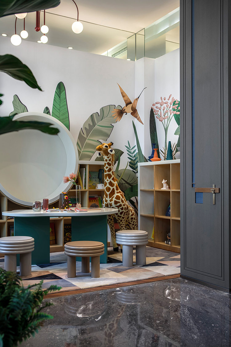 水吧與兒童活動(dòng)區(qū)相鄰而設(shè),是設(shè)計(jì)師對(duì)空間平面布局的有效利用,設(shè)計(jì)上涵容藝術(shù)與個(gè)性,注入解構(gòu)主義的美學(xué)語匯,極簡的水吧與活潑的兒童活動(dòng)區(qū)對(duì)比鮮明,是對(duì)現(xiàn)代精致的兩種不同演繹,二者相映成趣。