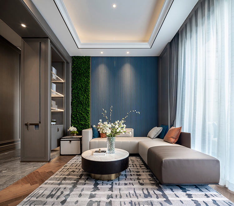 雅棕色胡桃木護(hù)墻板與綠植墻的拼接,中和了空間灰調(diào)的凝滯感,搭配米白色古典沙發(fā)、橘黃色單椅、幽藍(lán)色幾何圖案地毯、輕盈簡約的燈飾和復(fù)古意味的擺件,空間的布局依循著傳統(tǒng)與現(xiàn)代的美學(xué)隱喻,流露出簡雅的氣質(zhì),低調(diào)中質(zhì)感亦明顯。