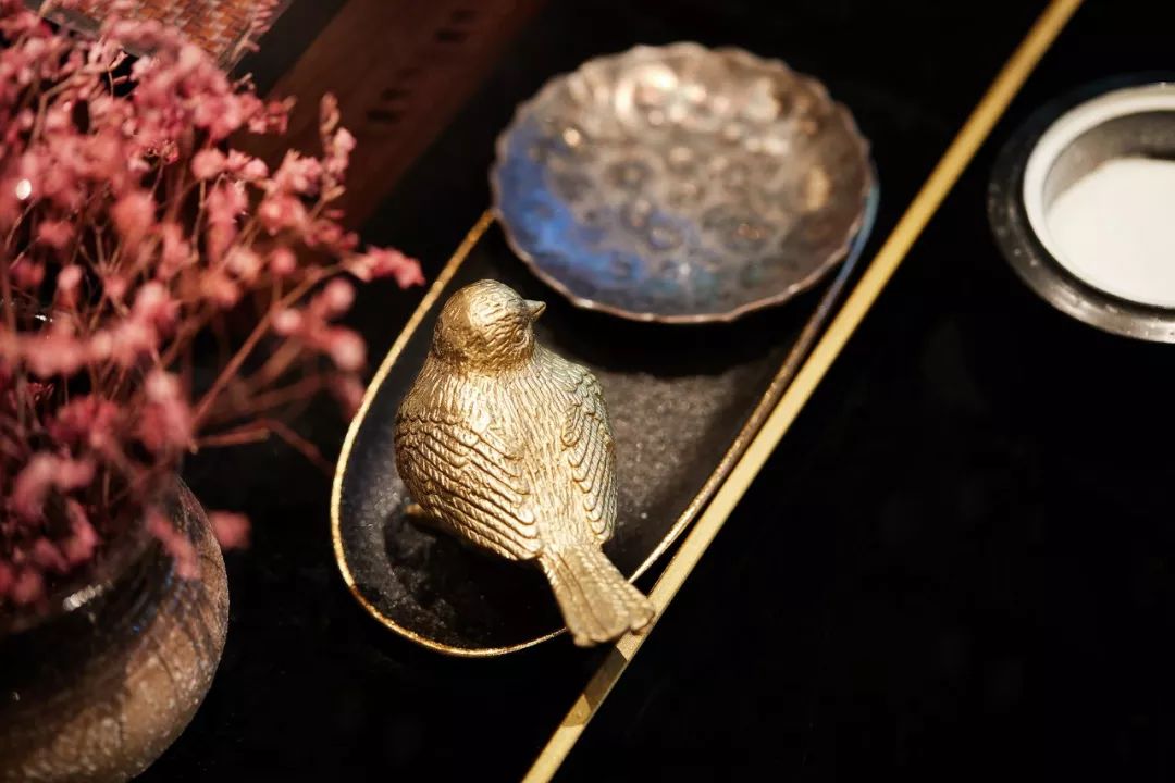 空間其余軟飾以現(xiàn)代清簡(jiǎn)形制統(tǒng)籌,大理石與木制桌面相嵌,泛著銅色的暖光燈點(diǎn)染悠悠氛圍,花枝俏逸,空間有著東方的大氣古雅之美。待嘉賓前來(lái),呈上一杯清茶,再引領(lǐng)他們走進(jìn)下一幕雅景。