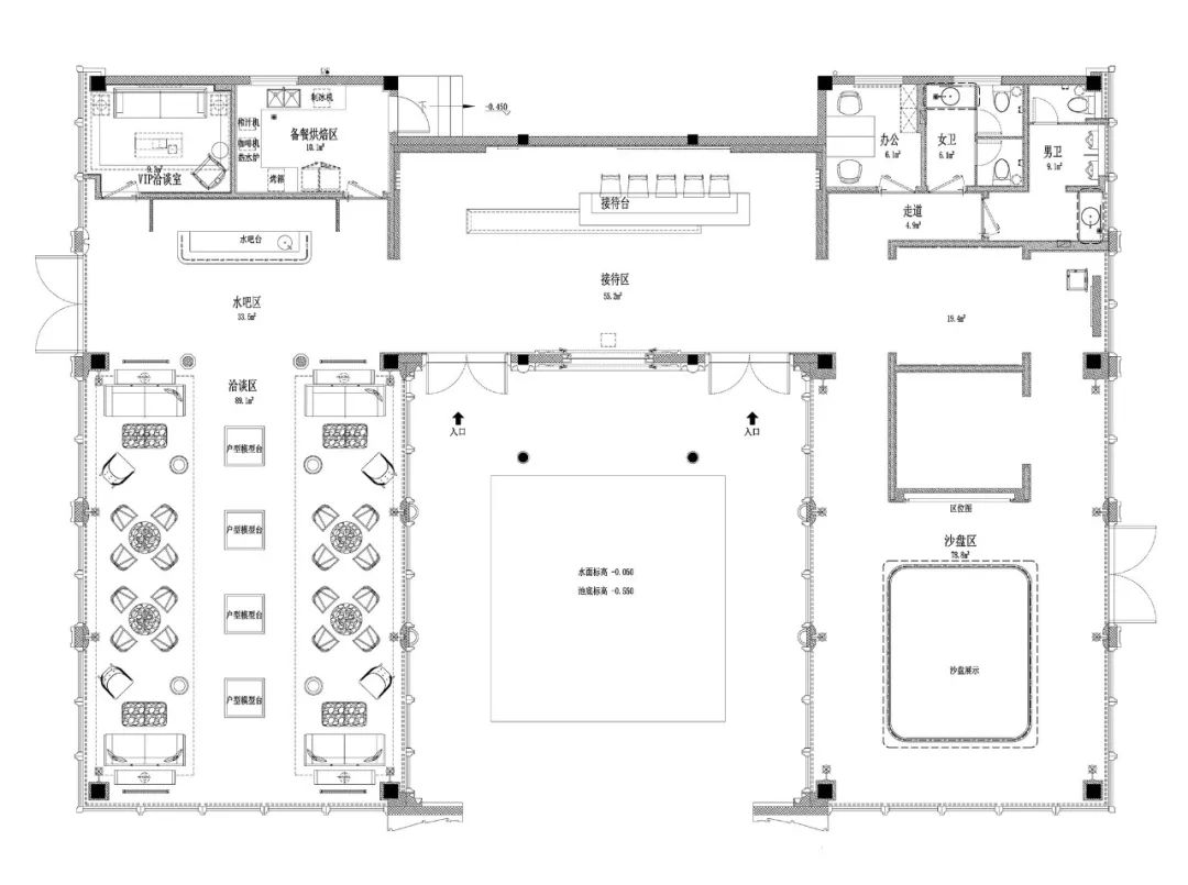 沙盤(pán)區(qū)的設(shè)計(jì)不加以過(guò)多復(fù)雜的元素,縞白四面墻體、簡(jiǎn)化的人字天花、門(mén)窗與燈飾上中式紋樣相搭,在空間中營(yíng)建起脈脈古意,透過(guò)紗幔可隱約觀賞門(mén)外幽然靜雅的園林綠景,閑適間有靜雅之感。