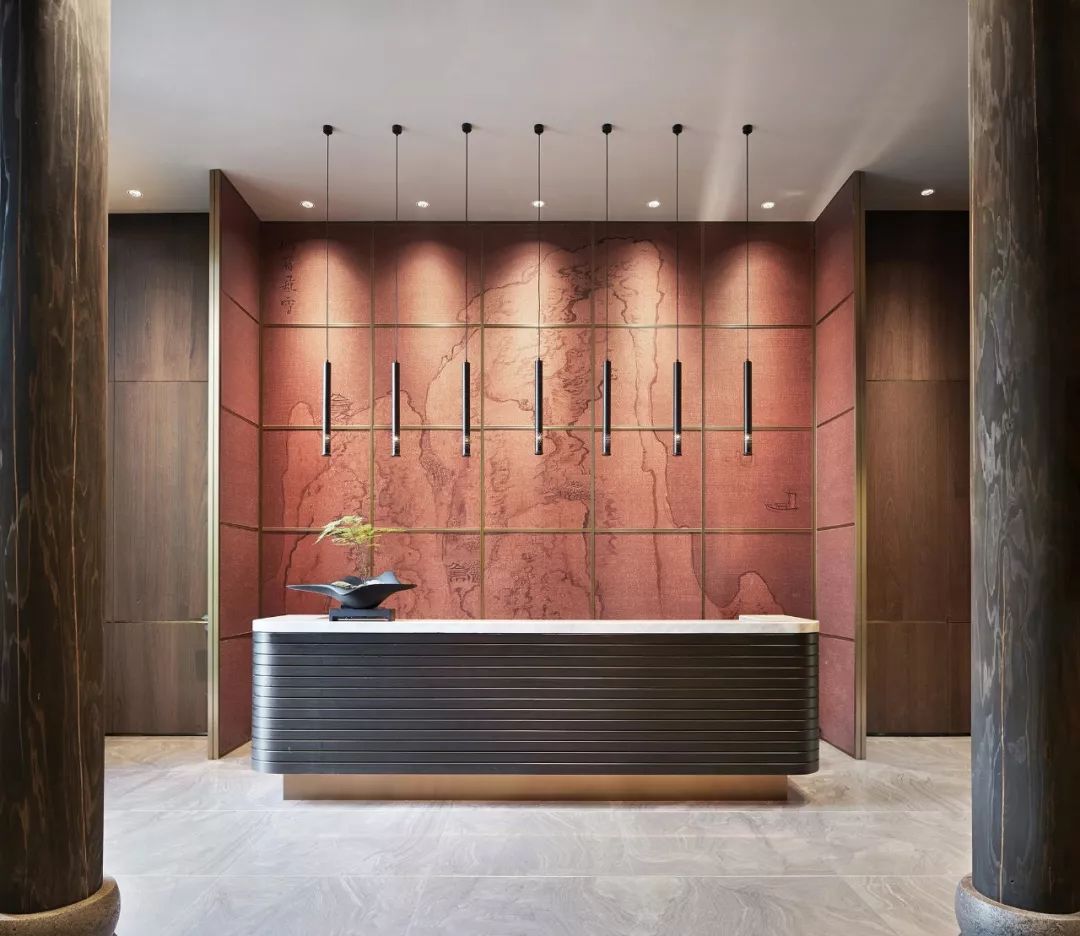 從古雅的庭院入宅,室內(nèi)是以現(xiàn)代清簡(jiǎn)材質(zhì)為形,以東方哲美意涵為里的風(fēng)韻藝境。步入接待門(mén)廳,納入眼里的是一面氣勢(shì)磅礴的藝術(shù)墻,正統(tǒng)且濃郁的朱紅色調(diào),與當(dāng)?shù)貕验煹暮@艘庀螅靡詡鹘y(tǒng)手工藝漆線(xiàn)雕制作,是設(shè)計(jì)對(duì)唐朝壁畫(huà)與雕刻藝術(shù)文化的另一種延續(xù)與解讀。