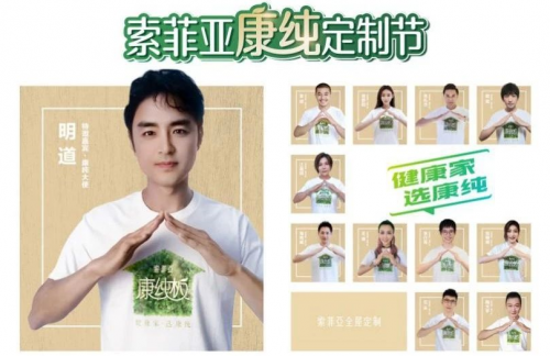 活動(dòng)前期,每一位索菲亞康純大使都身穿印有“索菲亞康純板”和“健康家,選康純”口號(hào)的白色文化衫,雙手指尖并攏,放在胸前擬作屋頂?shù)男螤?,詮釋著將與索菲亞一起致力于呵護(hù)家庭健康,共筑美好家的愿景,呼吁大家一起加入共同為健康環(huán)保的家居生活而努力。