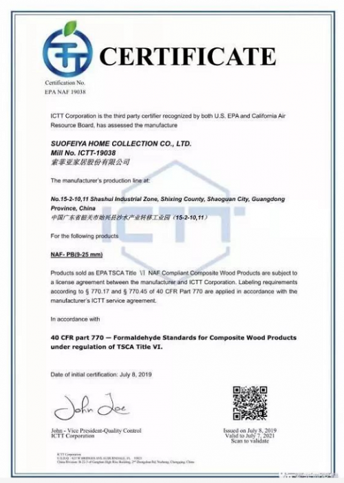 在2019年7月,索菲亞康純板刨花板板芯順利通過檢測,獲得美國環(huán)境保護(hù)署(EPA)無醛豁免認(rèn)證——EPA NAF,這是康純板板芯高環(huán)保等級(jí)的有力證明。