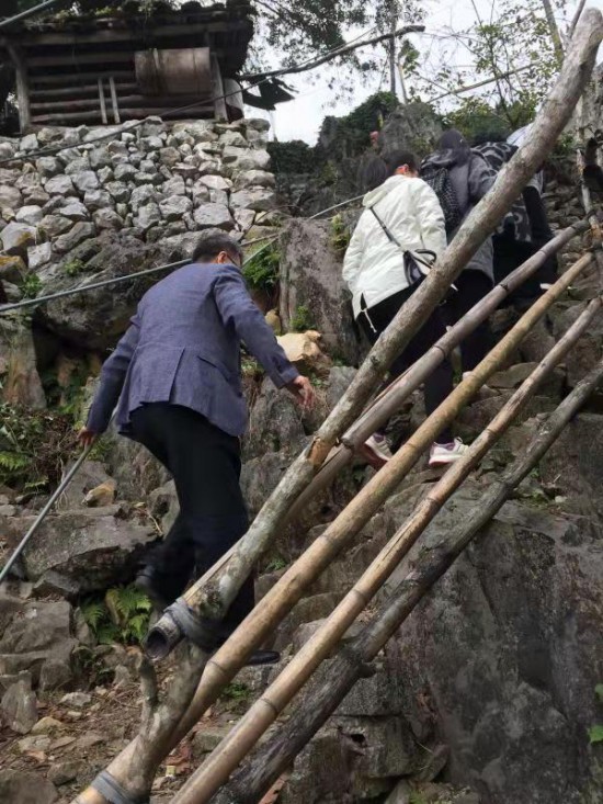 在他的帶領下,我們沿著僅30厘米寬70度陡斜石砌小路,拜訪了后龍村的特困村民,簡陋昏暗的夯土屋以吊腳樓形式半靠于山坡上,幾乎6面透風。