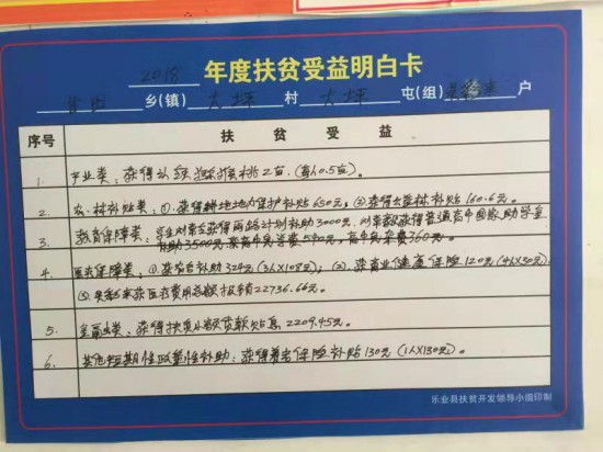 從每個特困戶的墻上,每個貧困村的村口,我們看到一張張公開公示的村《扶貧成效明白卡》,戶《扶貧受益明白卡》。年度實現(xiàn)扶貧成效道路硬化、村內亮化、安全飲水工程、危房改造、補助補貼金額明細等等。
