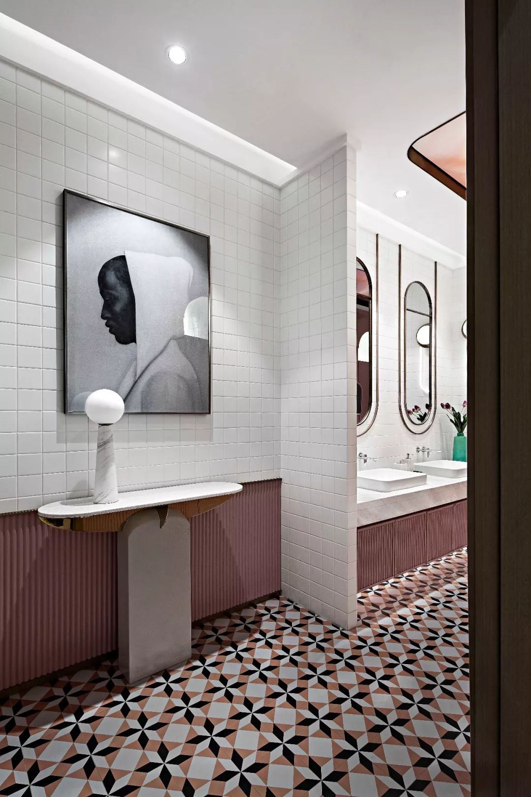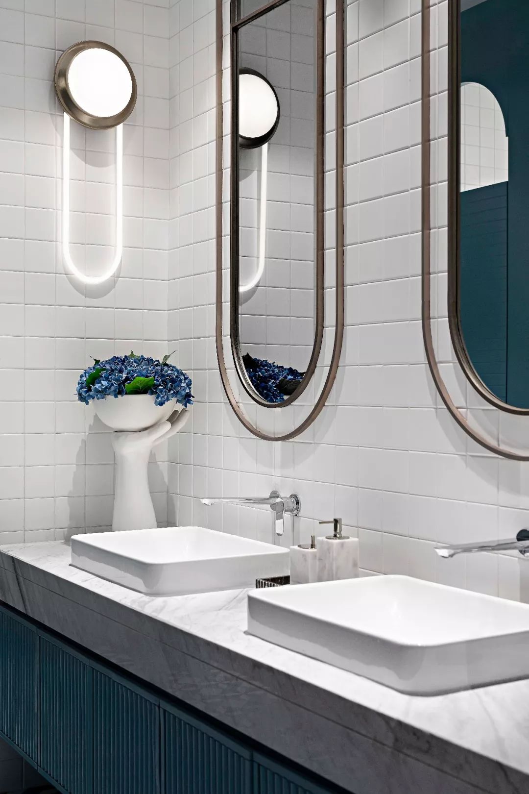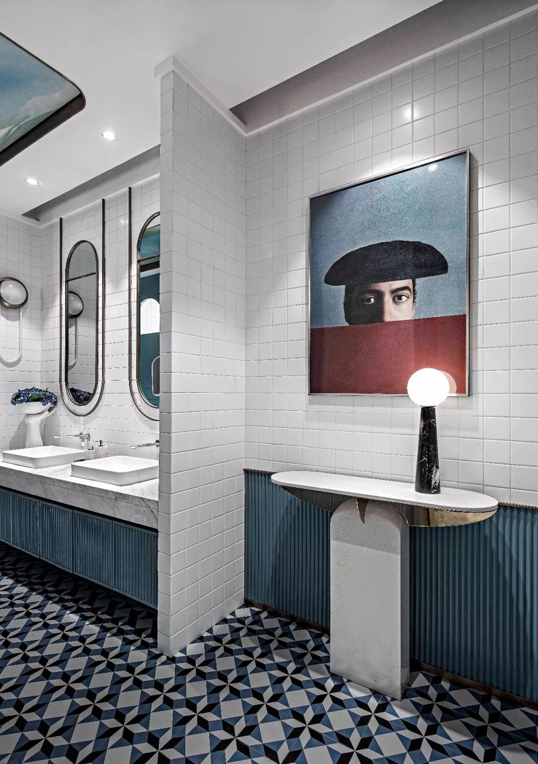 洗手間的折線運(yùn)用達(dá)至高潮,直線、曲線、幾何體...各種形態(tài)的線條共處一室,以線、面、體的綜合形式進(jìn)行空間形態(tài)的表達(dá),從平面到立體自然轉(zhuǎn)化。大面積的純色色塊制造一種強(qiáng)烈的心理震撼力,營(yíng)造張揚(yáng)有力、現(xiàn)代時(shí)尚的空間意境。