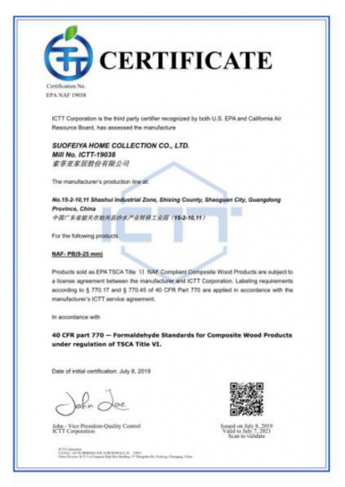美國環(huán)境保護(hù)署頒發(fā)的EPA(NAF)無醛豁免認(rèn)可