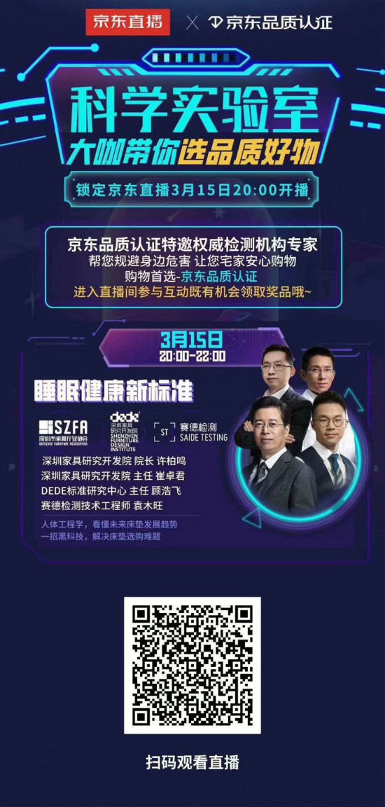 于是,電商巨頭京東和深圳時尚家居設計周全面牽手,以品質為核心,以高標準和獨特標準為基礎,聯(lián)合深圳家具研究開發(fā)院標準研究中心,深圳市賽德檢測技術有限公司作為技術單位,打造了一系列線上線下活動。用專業(yè)檢測,為消費者提供更有權威和說服力的品質產(chǎn)品,這是京東和深圳時尚家居設計周達成戰(zhàn)略合作的契機,也是3月18日這場“好睡眠、新標準”線上發(fā)布會如此吸睛的原因。此次發(fā)布會由京東家具、深圳市家具行業(yè)協(xié)會、深圳時尚家居設計周發(fā)起,深圳家具研究開發(fā)院標準研究中心,深圳市賽德檢測技術有限公司作為技術單位聯(lián)合推出。